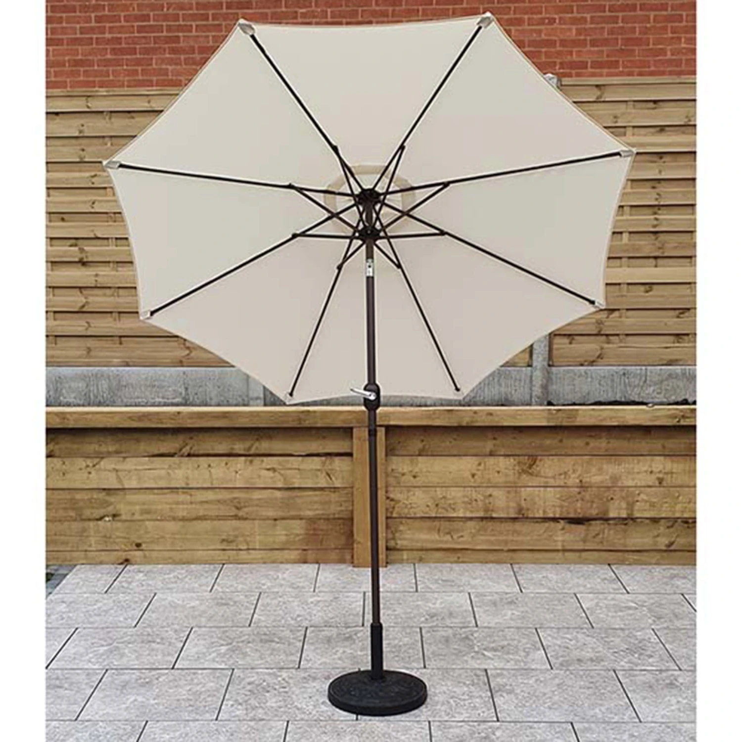 The perfect addition to your garden or outdoor space with this 2.5m Beige Table Parasol, use to shelter from the sunshine. This outdoor parasol spans 2.5 metres wide and is finished with a sleek black frame with a natural beige canopy. This garden parasol is heavy-duty and is made with polyester to withstand all weather conditions including heavy rain and sun. The parasol features a handle to wind up and down and is complete with a button to release the tilt function.