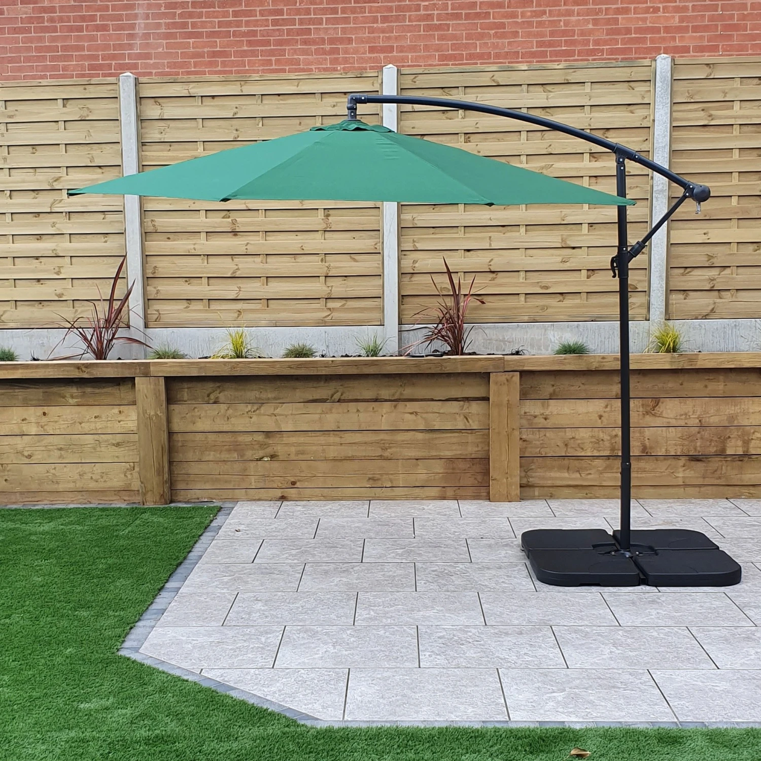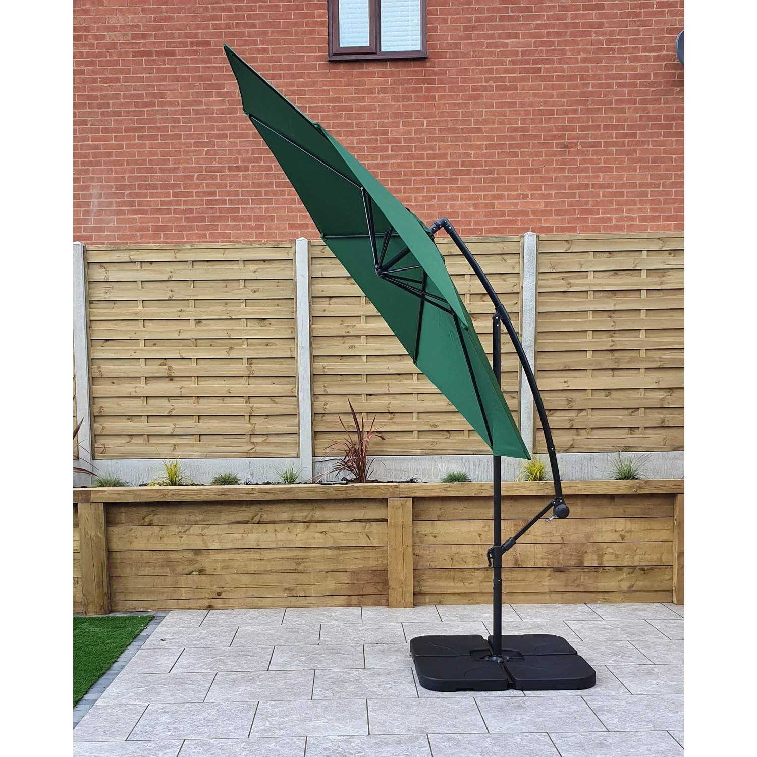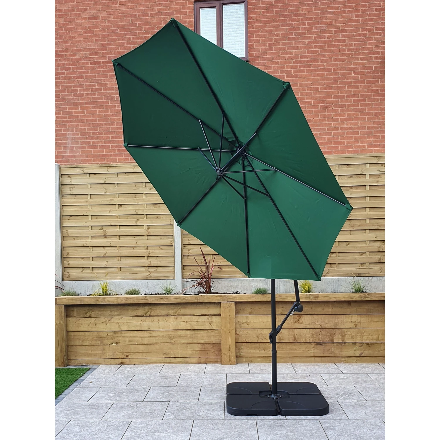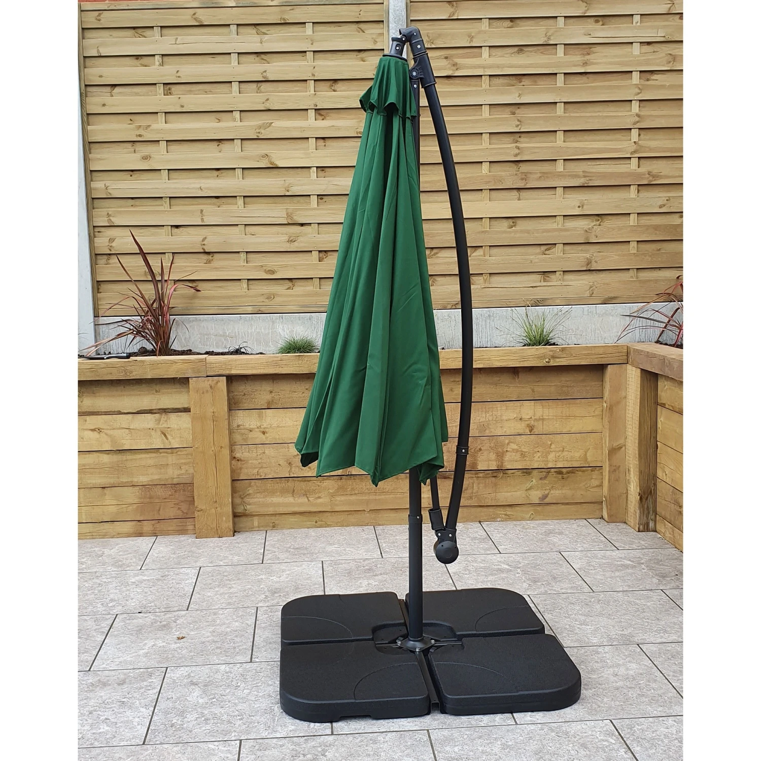 Add this 3m Green Canopy Banana Parasol to your garden to shade from the sunshine. This outdoor parasol spans 3 metres wide and is finished with a black frame with a stunning green canopy. This garden parasol is heavy-duty and is made with polyester to withstand all weather conditions including heavy rain and sun. The paroral is complete with a crank handle to easily raise and handle to wind up and down.