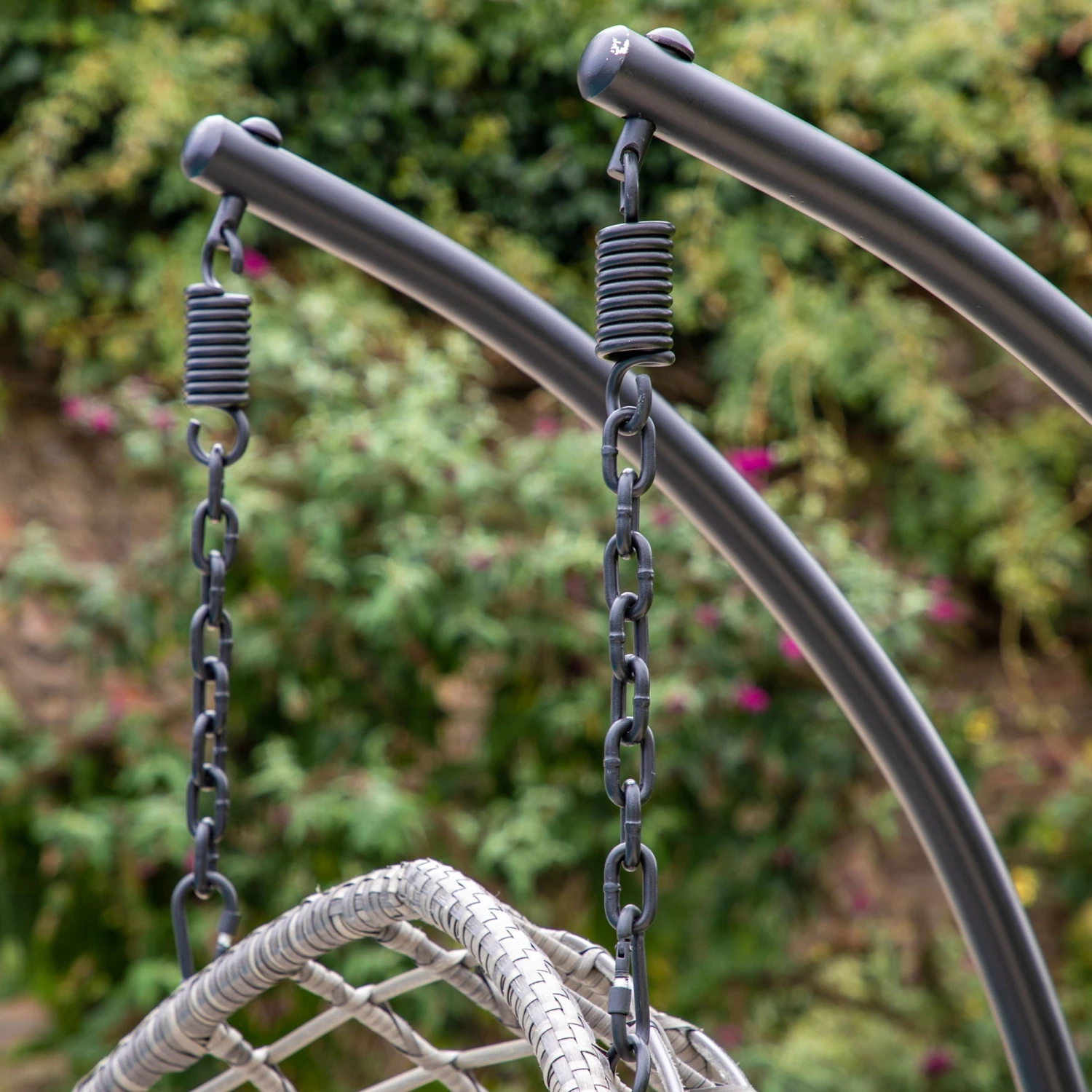Adding luxury and style to your garden with this Adanero Natural Hanging 2 Seater Chair. Relax in this charming rattan style hanging chair. This 2 seater features grey showerproof cushions with 2 head rests attached to the egg shaped chair. This luxury chair is not just ideal for garden but balconies and poolside spaces or even as an indoor chair. During the winter months the chair can easily be dis-assembled