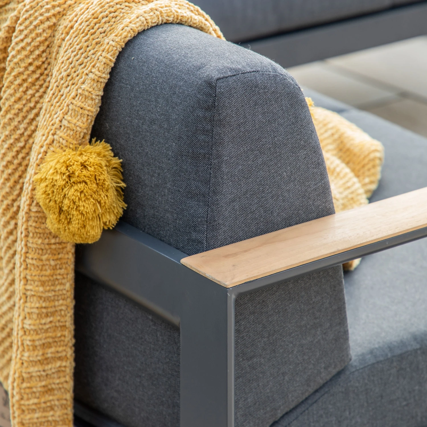 Brining a minimalist design to your outdoor space with this Agrigento Grey Corner Sofa 218 x 218 x 59 cm. The sofa comes in a stunning charcoal grey tone, the padded cushions are covered in all-weather fabric and are resistant to fading, mould and stains as well as being fast drying. The sofa sits on a black aluminium frame featuring clean lines with teak trimming to the arms for a retro charm.