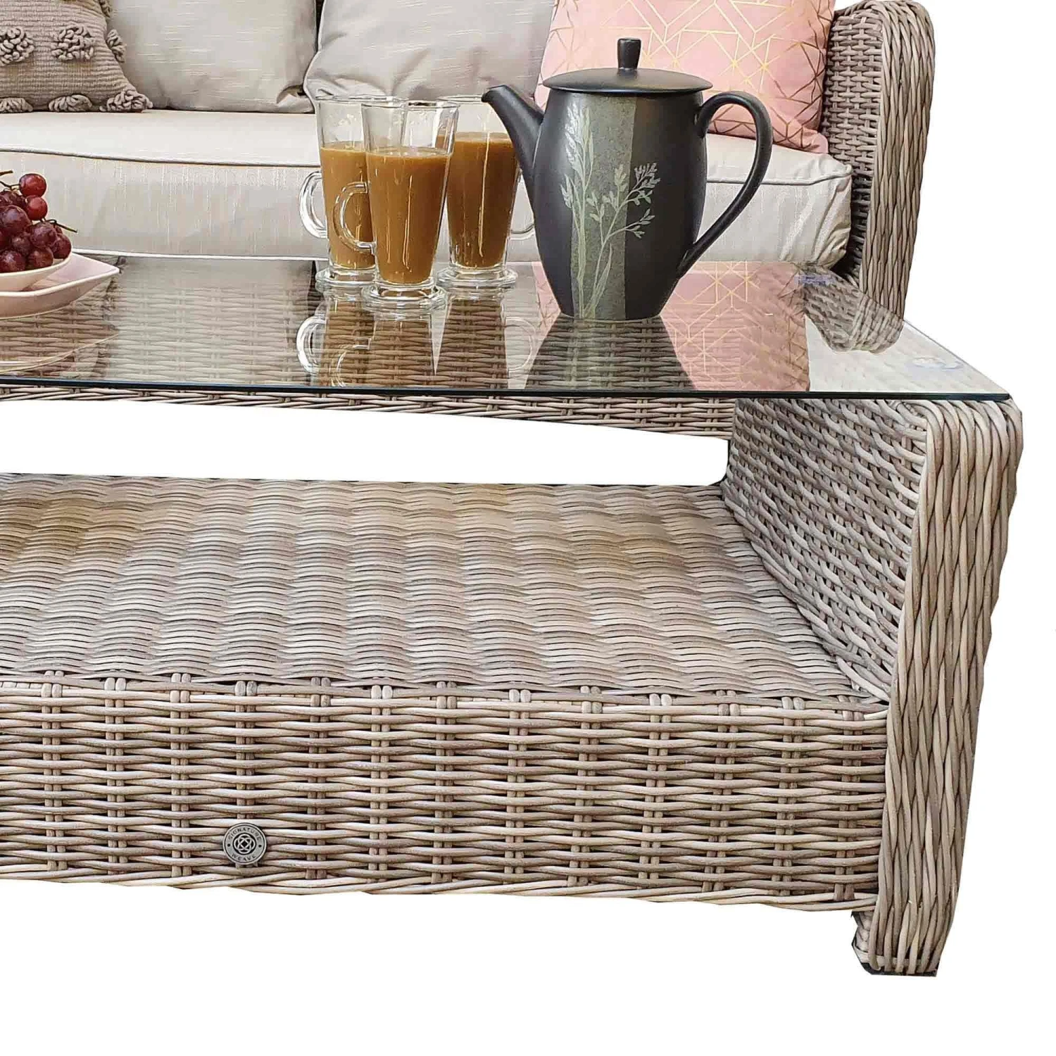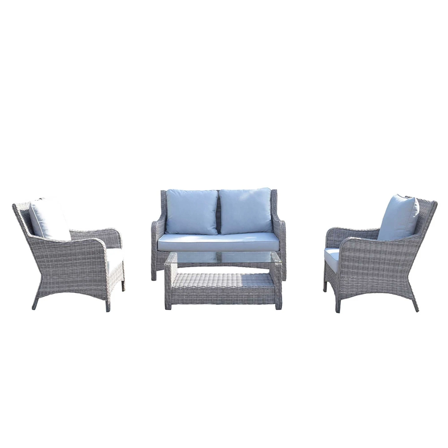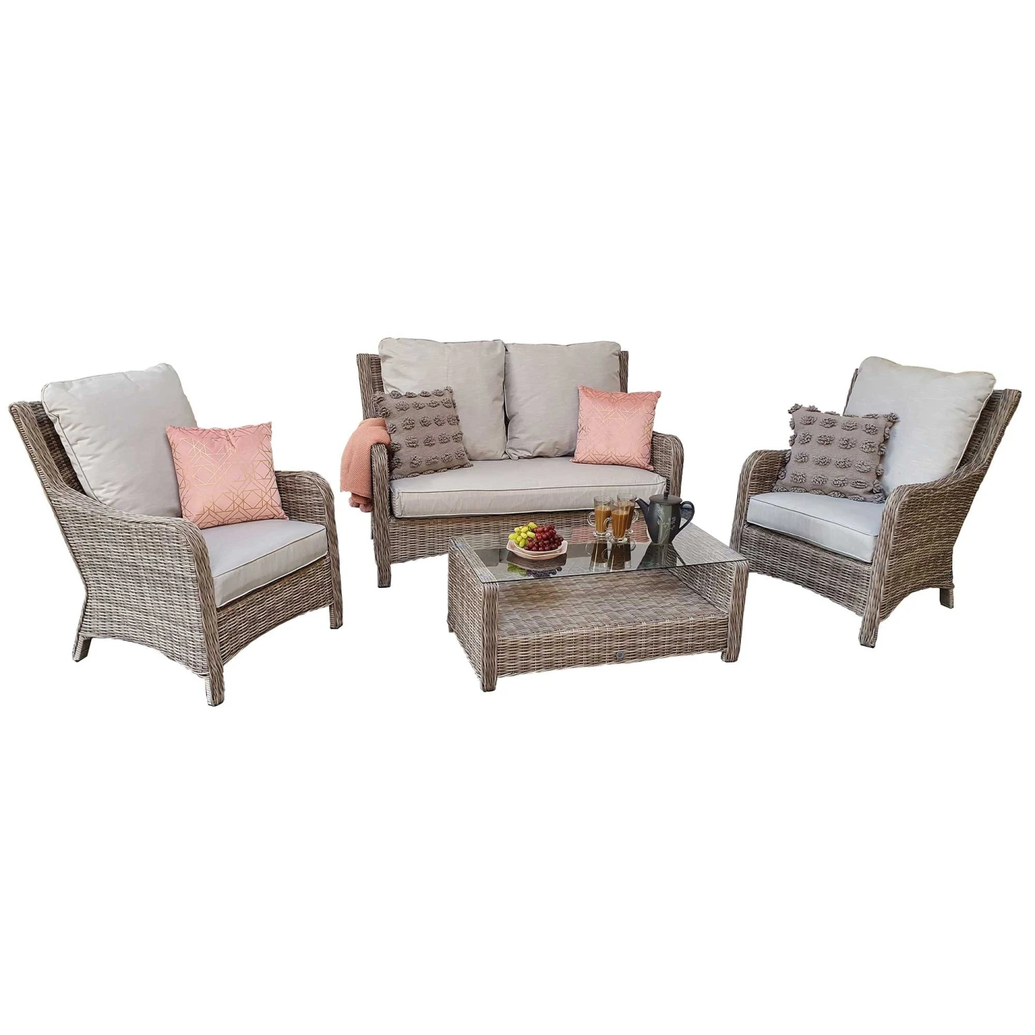 This Alexandra Grey Rattan 2 Seater Sofa Set is ideal for seating up to 4 people in the garden! Made from high quality UV treated rattan, this outdoor sofa set is finished in Fine Grey and supplied with Silver Grey cushions for a comfy and contemporary look. The table features a tempered glass top and shelf, great for serving snacks and drinks in any outdoor space.