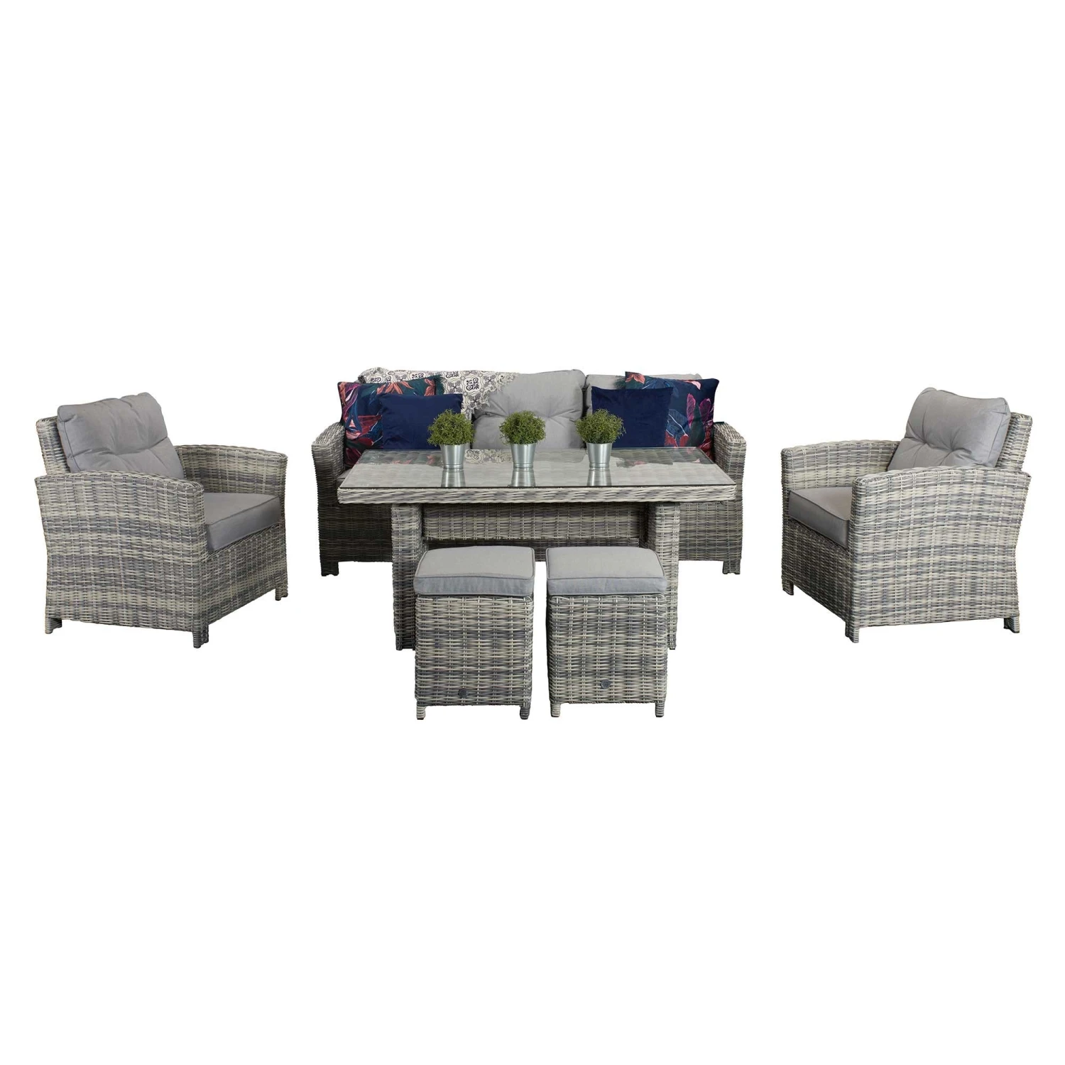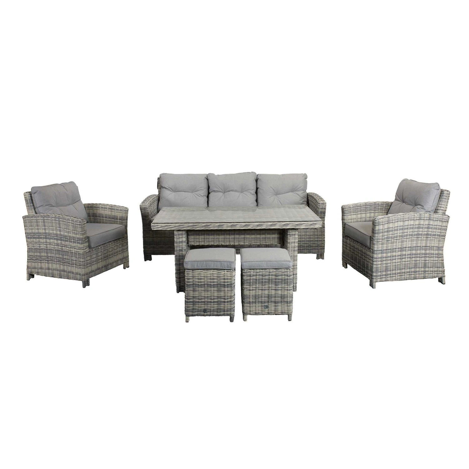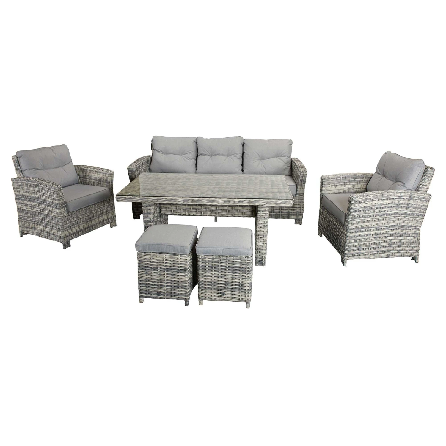Keep your friends happy and comfy with this Amy Grey Rattan 7 Seater Sofa Dining Set! This beautiful garden dining set features a 3 seater sofa, two armchairs, two stools and a long table suitable for outdoor dining. Made from high quality UV treated rattan, this outdoor furniture set seats up to 7 people and is ideal for all weather conditions. All furniture features powder coated aluminium frames and pale grey cushioned seats.