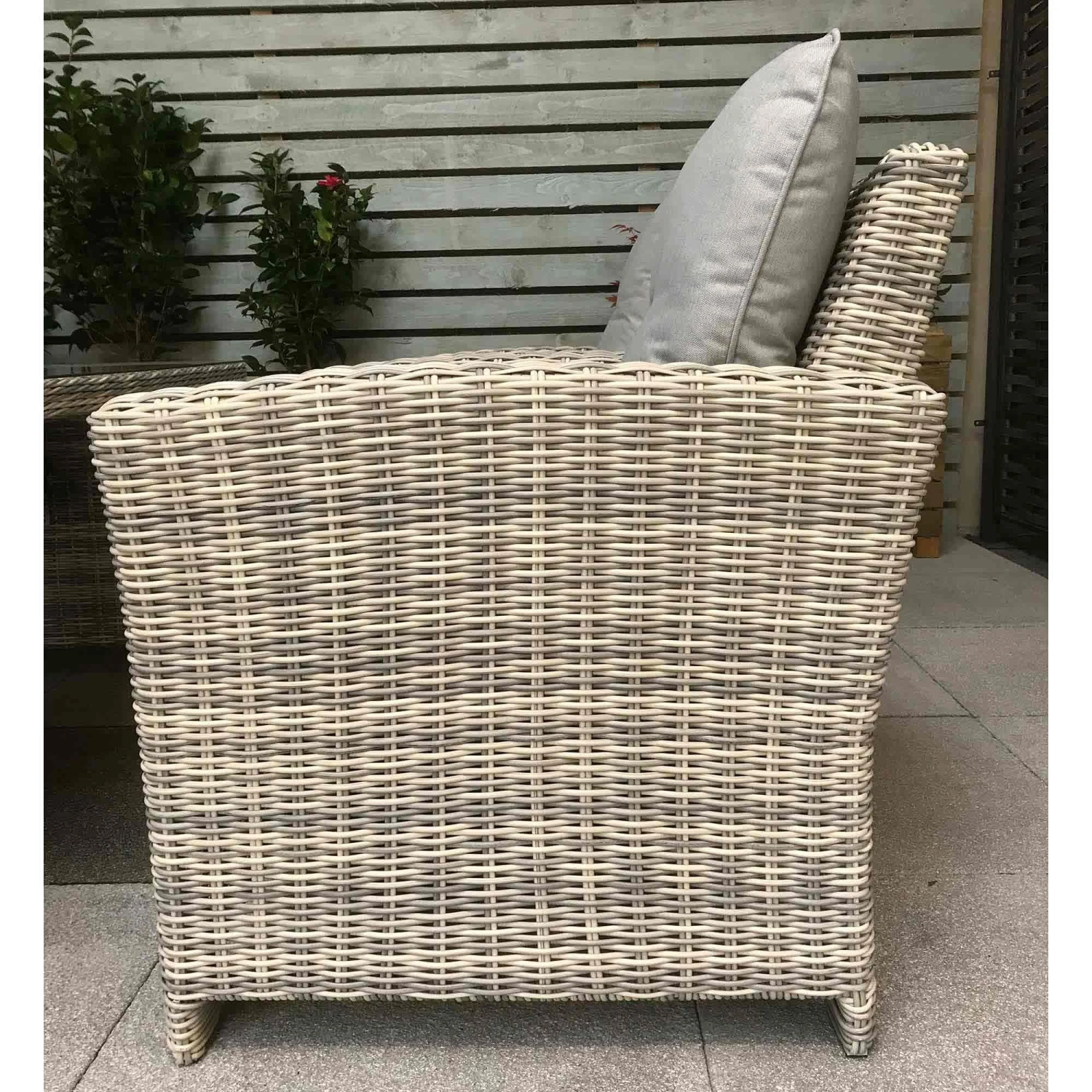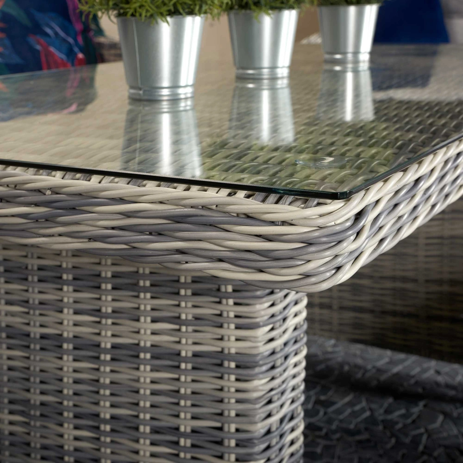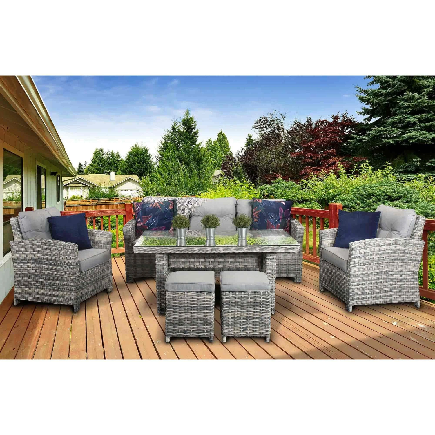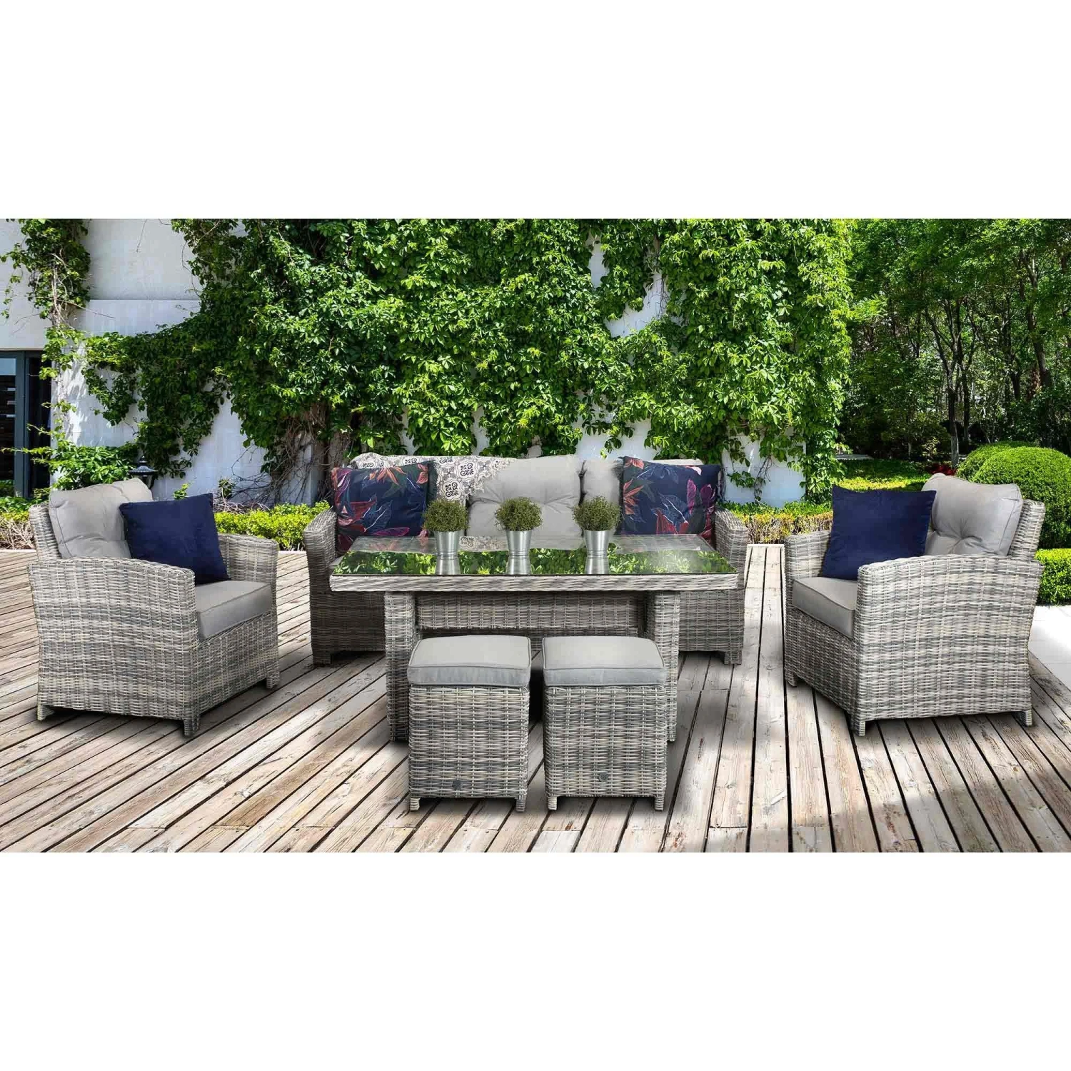 Keep your friends happy and comfy with this Amy Grey Rattan 7 Seater Sofa Dining Set! This beautiful garden dining set features a 3 seater sofa, two armchairs, two stools and a long table suitable for outdoor dining. Made from high quality UV treated rattan, this outdoor furniture set seats up to 7 people and is ideal for all weather conditions. All furniture features powder coated aluminium frames and pale grey cushioned seats.