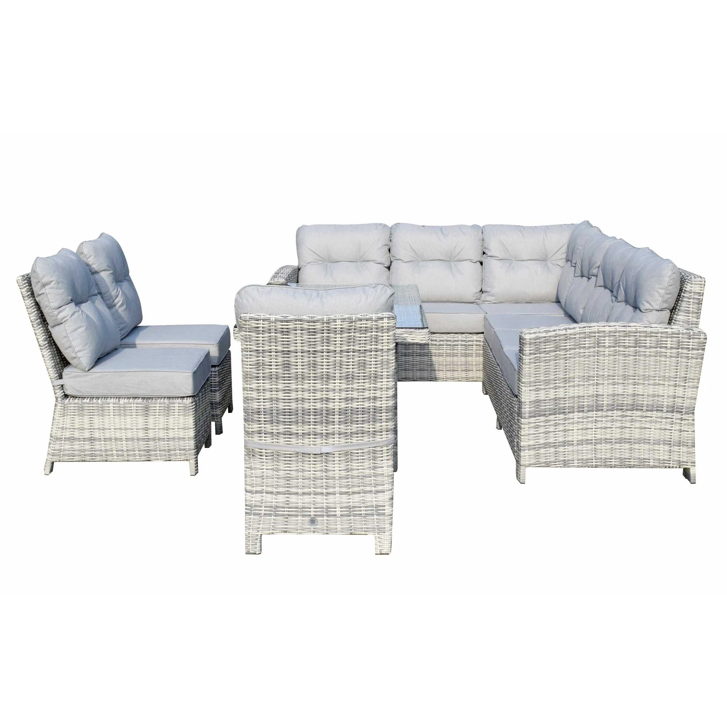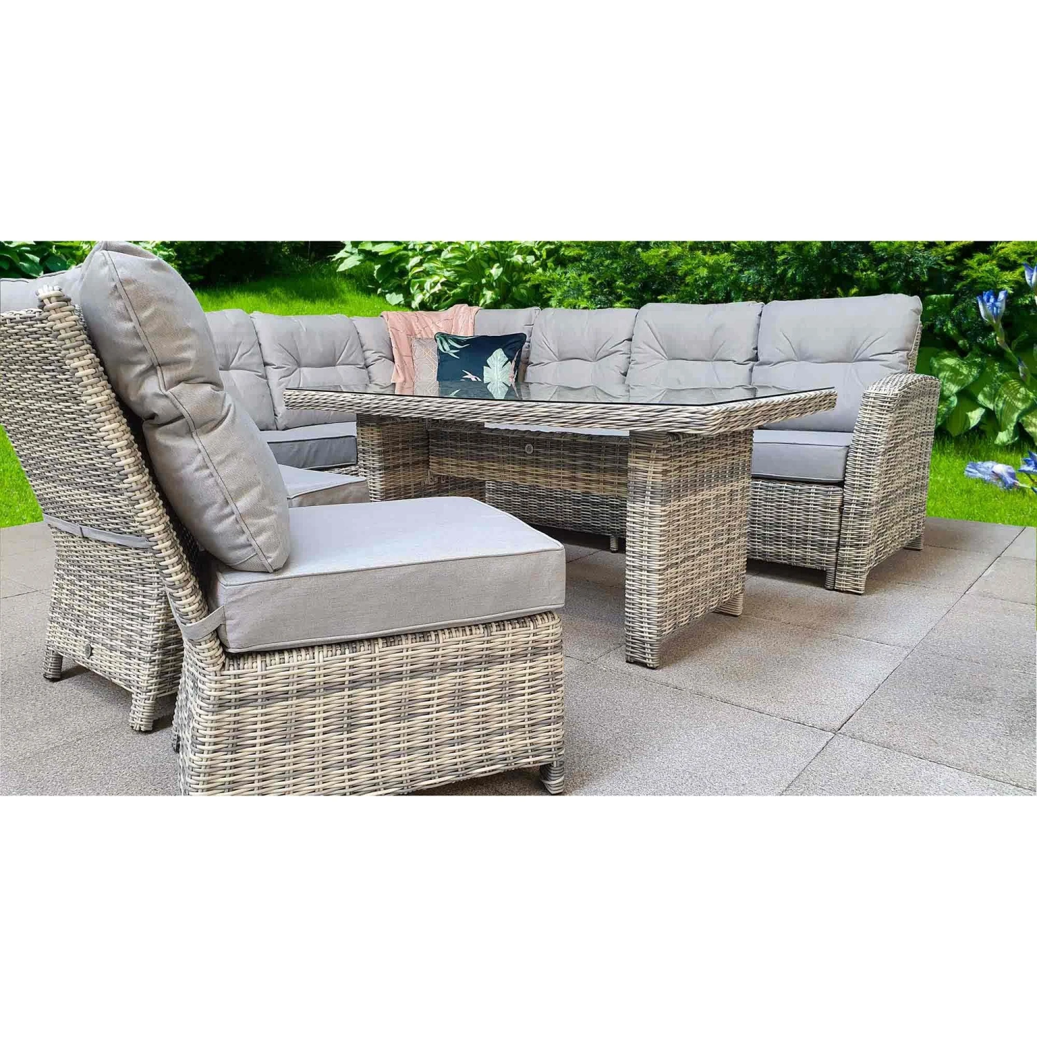 This Amy Grey Rattan Corner Sofa Dining Set with 3 Chairs is the ideal solution to your outdoor dining experience! Featuring a large and comfy corner sofa, three chairs and a table, this rattan furniture set is just what you need to enjoy meals outdoors! All seats are supplied with pale grey cushions which compliments the grey rattan look. Made from UV treated rattan and powder coated aluminium frames suiting all weathers, plus a glass table top finish.