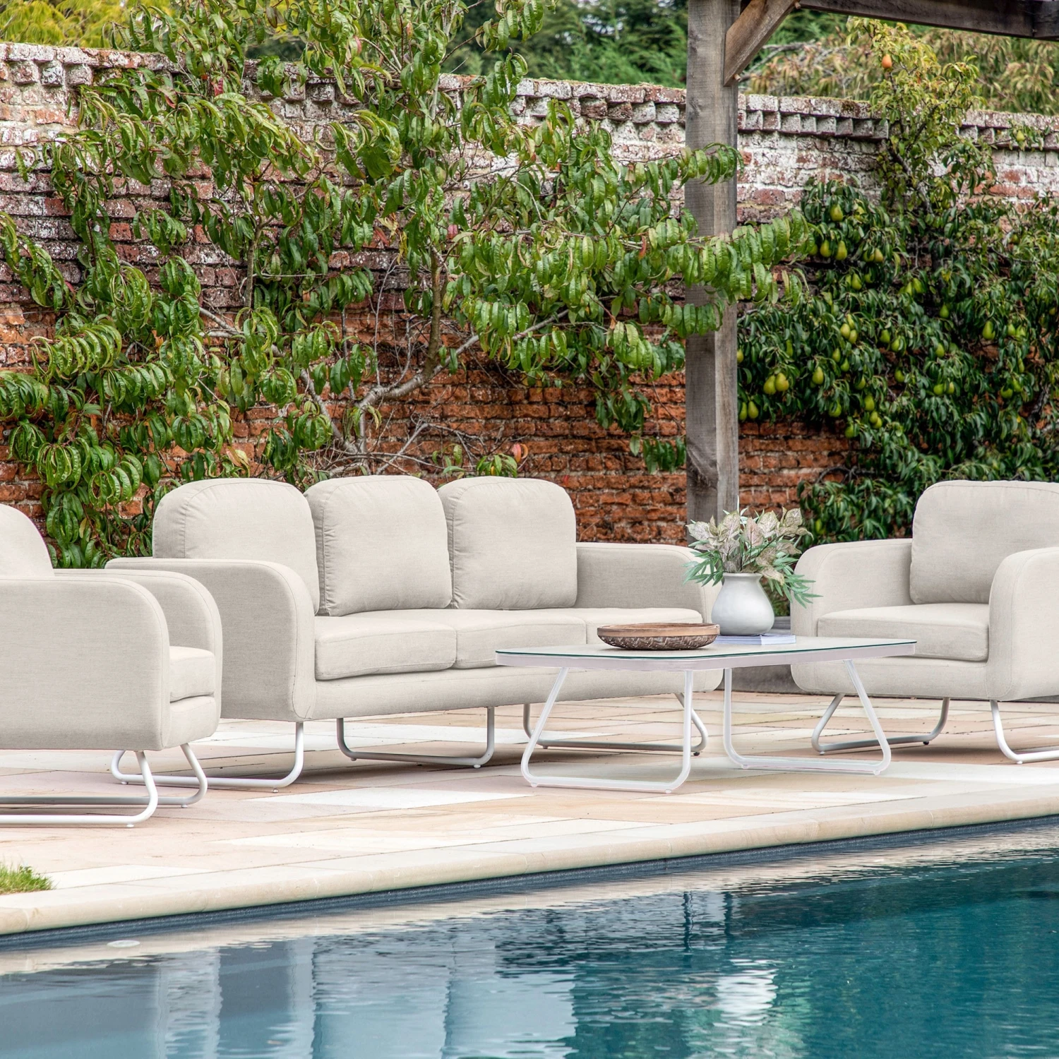 Bringing a touch of luxury to your garden or by your pool with this Ancona Linen 5 Seater Lounge Set in a stunning summer linen shade. The set features a 3-seater sofa, 2 chairs, coffee table and free covers for the seating. The products sit on aluminium white frames and feature upholstered in all-weather fabric with quick drying foam and resistant from fading, stains and mould. The rectangular shape coffee table has a glass top with a ceramic effect finish.