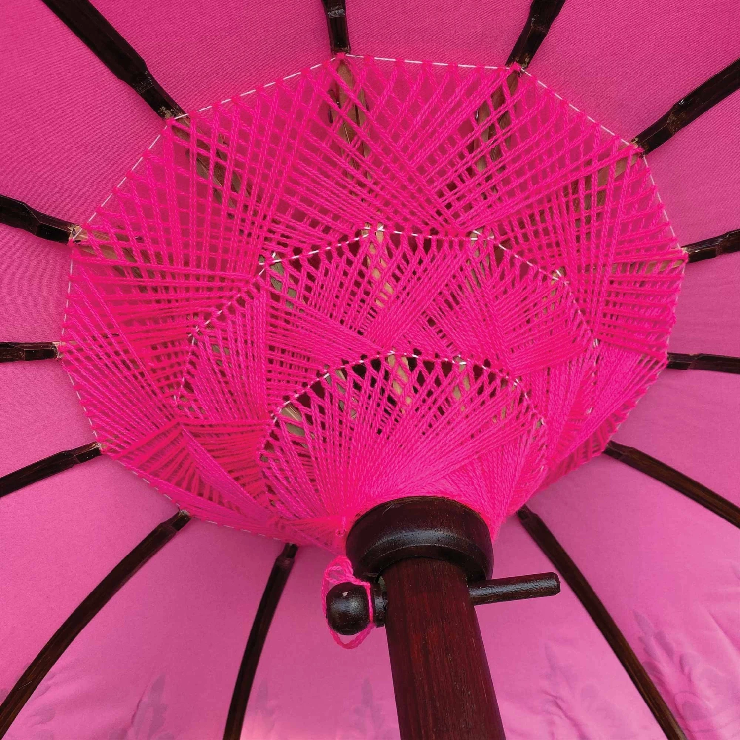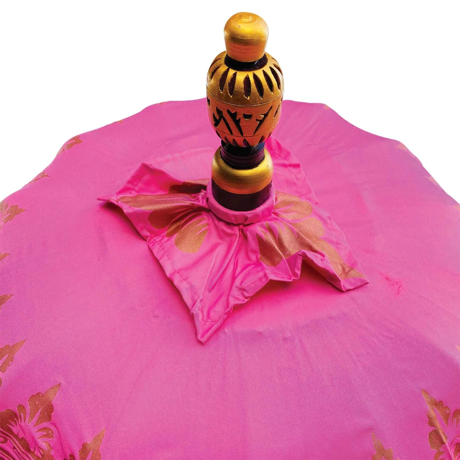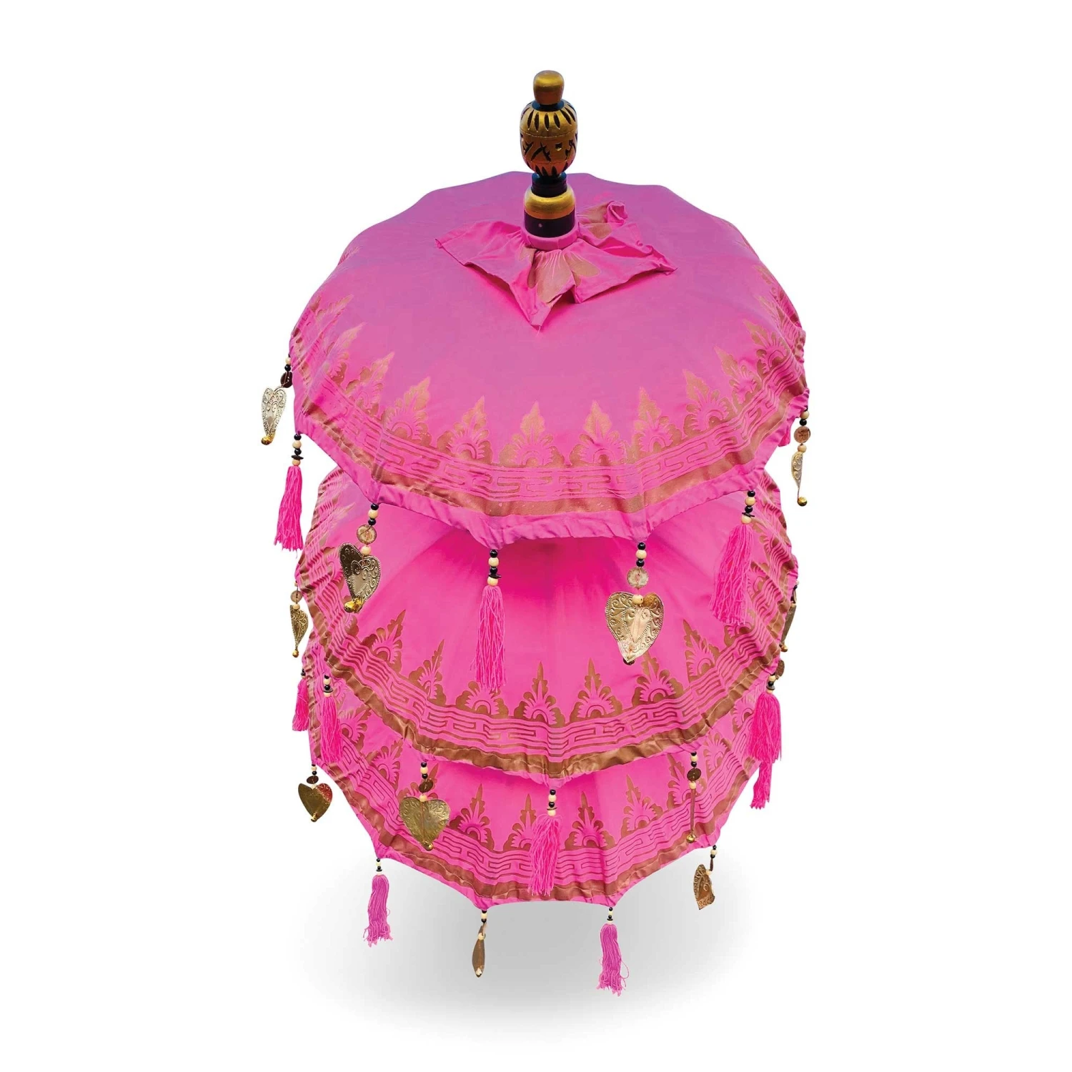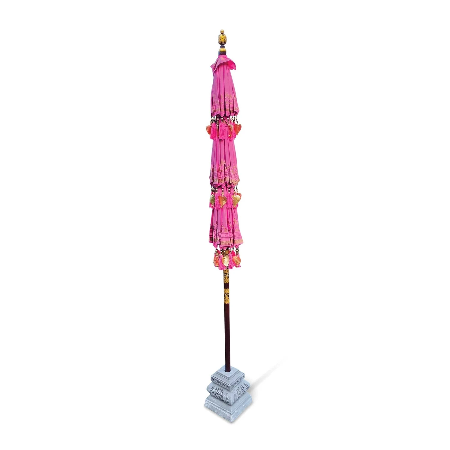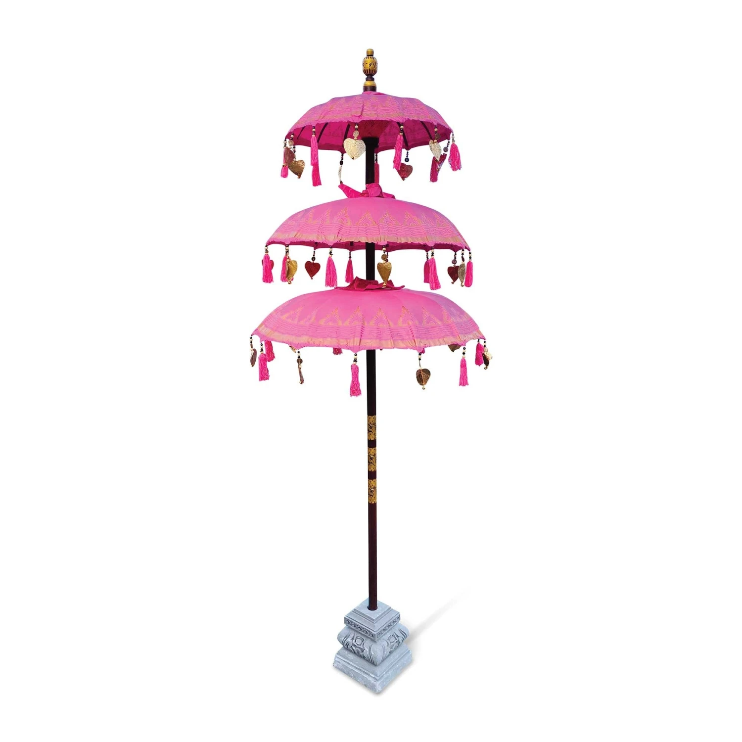 Introducing to you our stunning Bali Ceremonial Triple Parasol Pink & Gold, these beautiful parasols have been hand carved, hand printed and hand painted by a small family run business in Ubud, Bali. The authentic Balinese ceremonial parasol is perfect for adding a touch of colour in the garden or around the home, coming in vibrant colours with beading and fringing it is sure to create a wow factor.