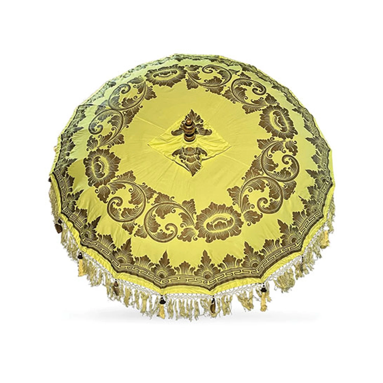 Expertly handwoven and hand painted, this Bali Large Sun Parasol Yellow And Gold 2.5m (With Pole Joint) is handcrafted in a small town called Ubud in Bali from a small family run business. Featuring an authentic Balinese decorative pattern and hand painted in a stunning yellow and gold colourway, it provides brightness and an impressive wow factor that will instantly upgrade your outdoor garden furniture. Coming attached to a solid thick wooden pole joint, it can be paired with one of our Bali Parasol bases, currently sold separately.