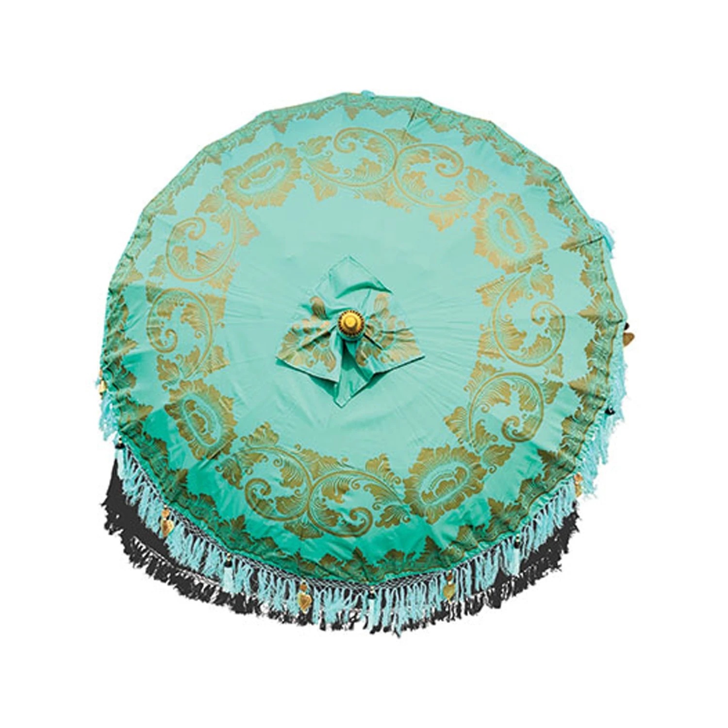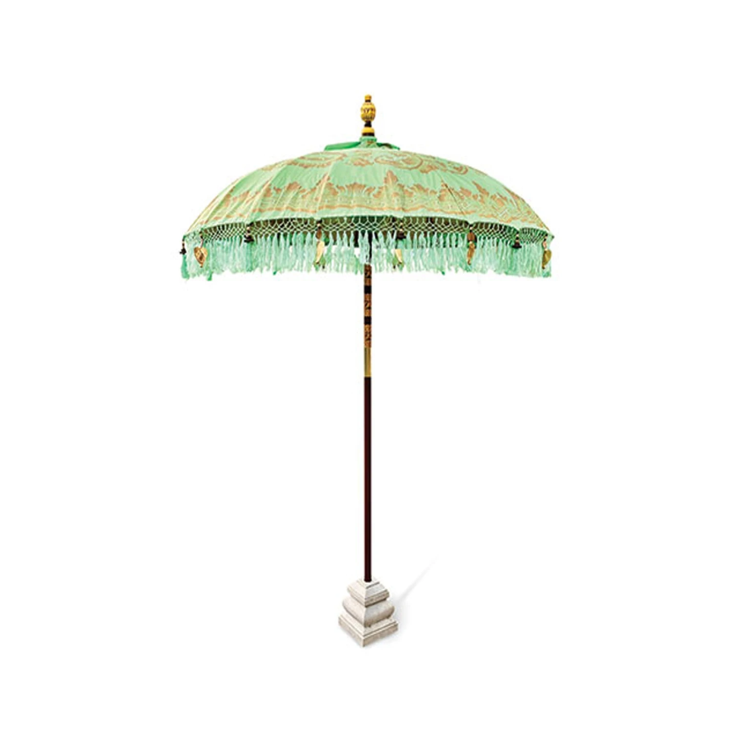 Introducing to you our stunning Bali Sun Parasol in Mint And Gold, these beautiful parasols have been hand carved, hand printed and hand painted by a small family run business in Ubud, Bali. The authentic Balinese ceremonial parasol is perfect for adding a touch of colour in the garden or around the home, coming in vibrant colours with beading and fringing it is certain to create a wow factor. Ideal for dining out in the sun, this Bali sun parasol will protect you against a change in weather and shade you from the sun.