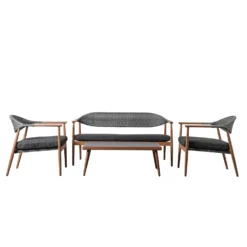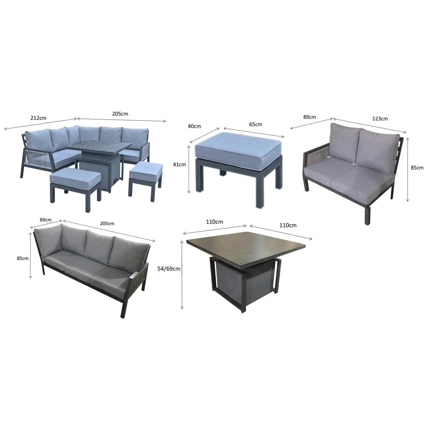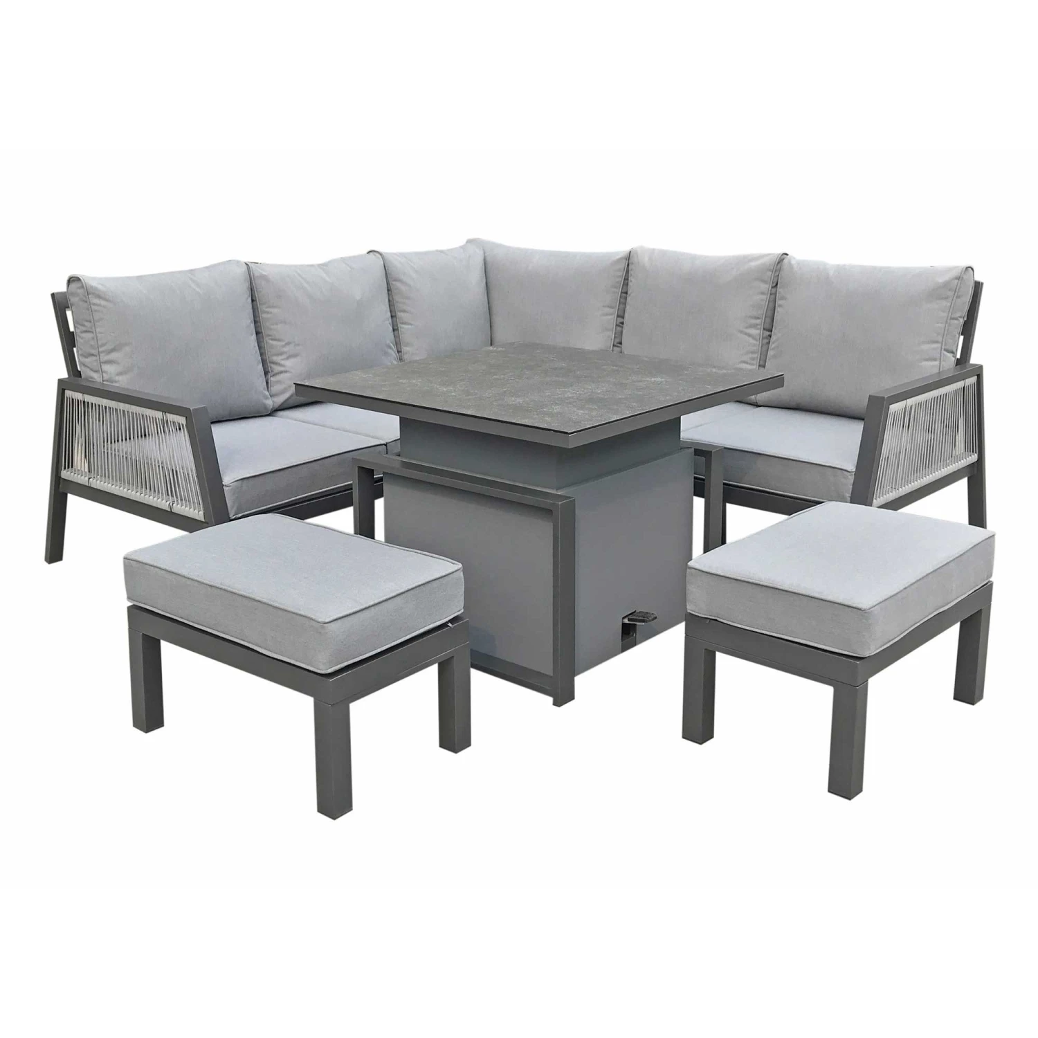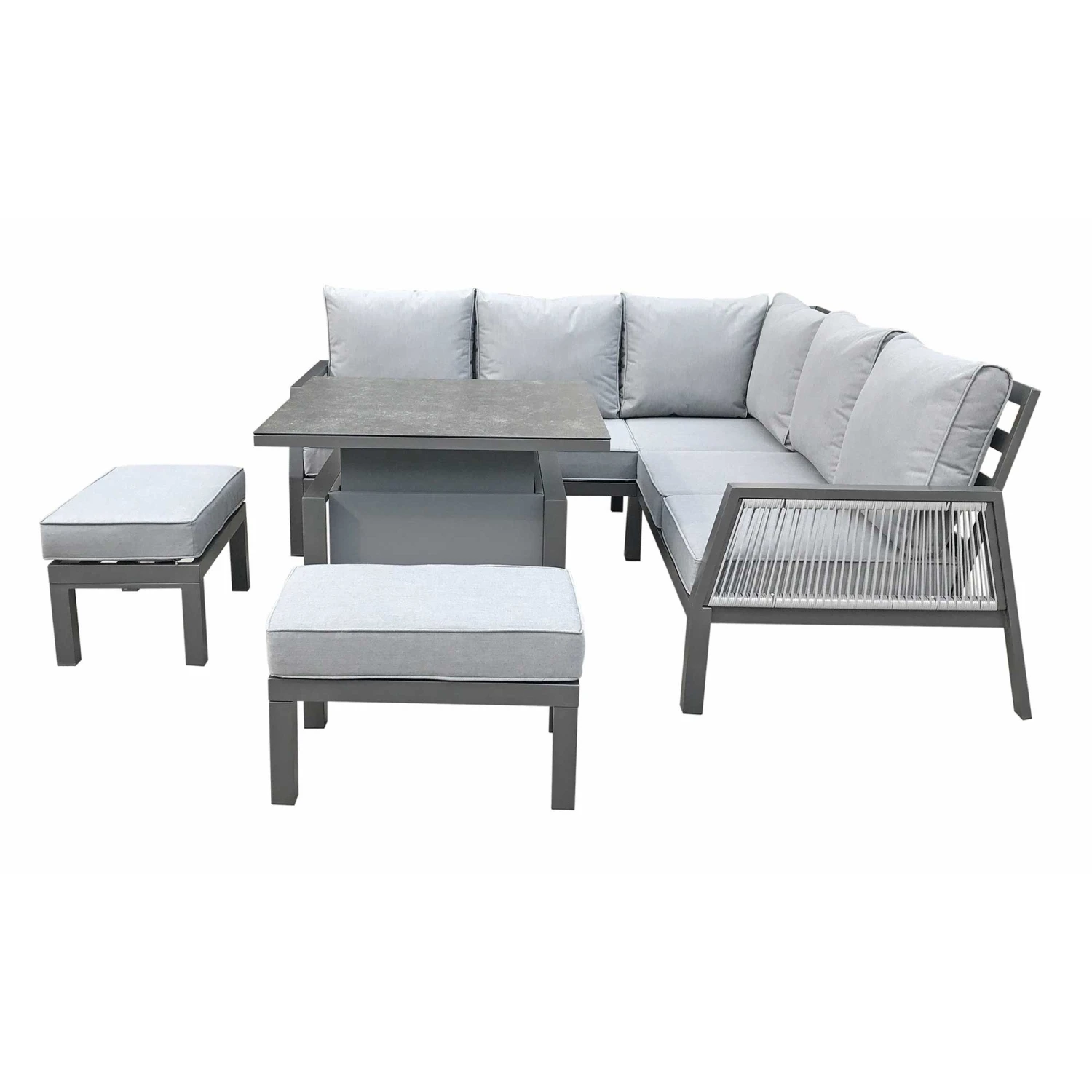 Add this Bettina Grey Aluminium Corner Sofa Dining Set with 2 Benches to your garden for the final finishing touch! This contemporary corner sofa dining set features a corner sofa, two benches and a gas lift table with an adjustable height! Ideal for use as a coffee table or dining table, this outdoor furniture set is ideal for eating, drinking and socialising. Complete with grey powder coated aluminium frames and water resistant fabric.Â
