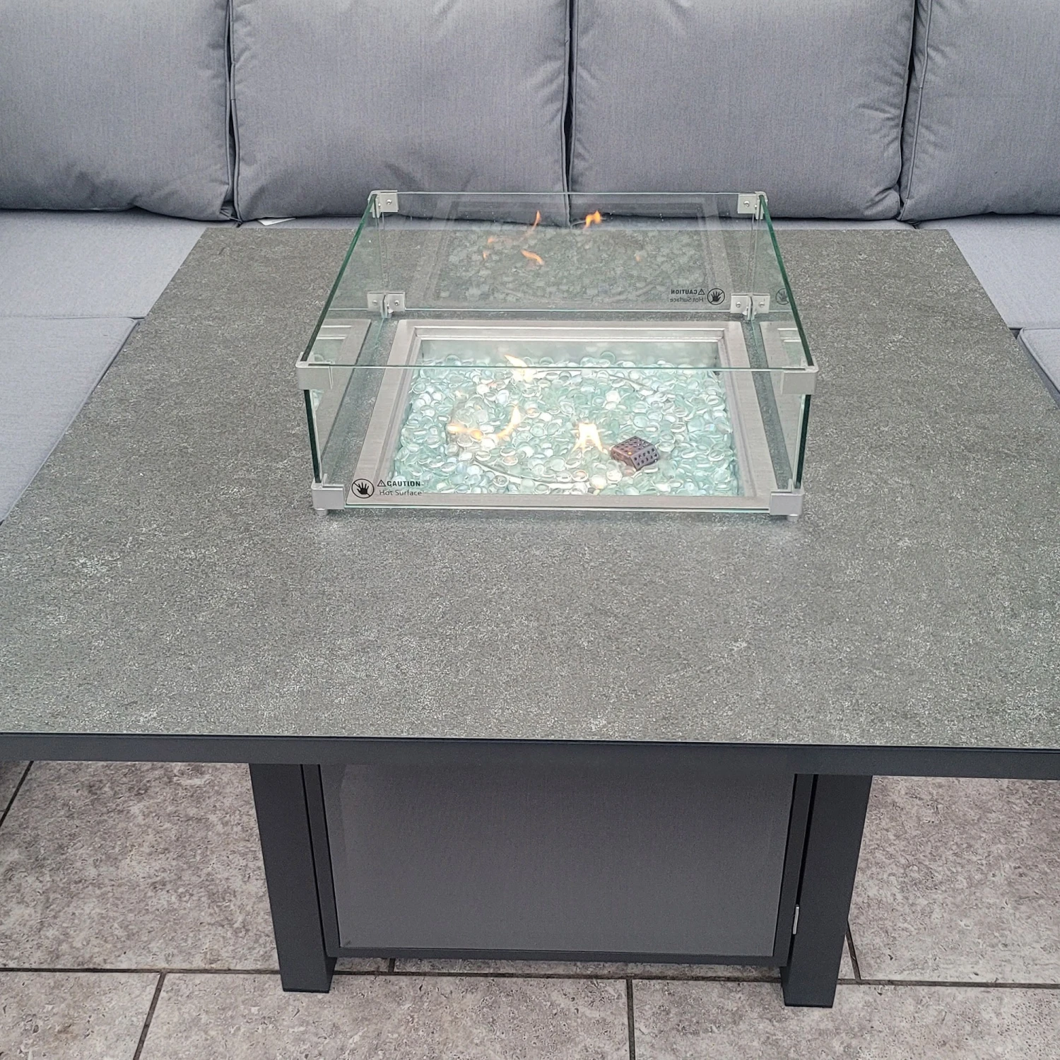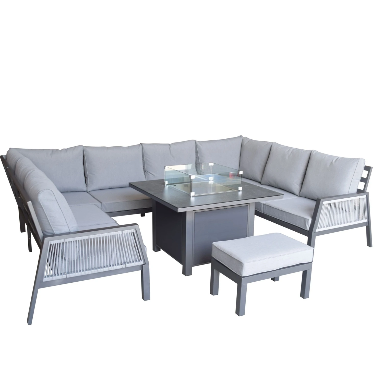 Bringing a touch of luxury to your garden or outdoor space with this Bettina Grey U Shaped Dining Sofa Set with Gas Fire Pit Table & Stool. This set features a stunning u shaped sofa and matching stool crafted with a powder-coated aluminium dark grey frame and are topped with padded grey cushions for comfort. The seating surrounds the stunning grey table featuring a luxury fire pit design in the middle.