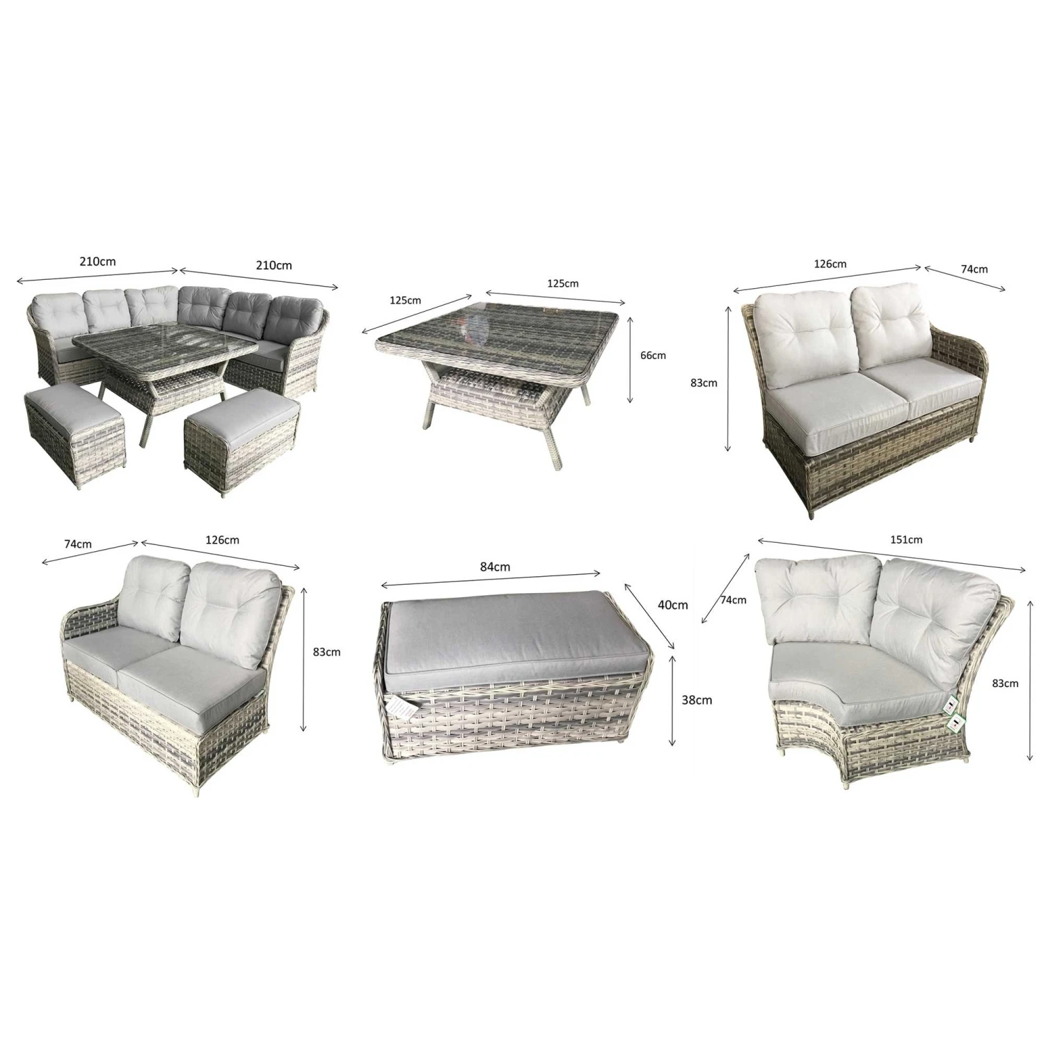 This Constance Silver Grey Rattan Corner Sofa Dining Set is fantastic for families and gatherings of all sizes! Ideal for the garden, patio or any other outdoor space, this rattan furniture set includes a large corner sofa, two benches and a square table with a glass table top and shelf. The outdoor furniture set is finished in silver grey rattan and paired with pale grey cushions for a contemporary look. Made with powder coated aluminium frames and UV treated rattan to suit most weather conditions.