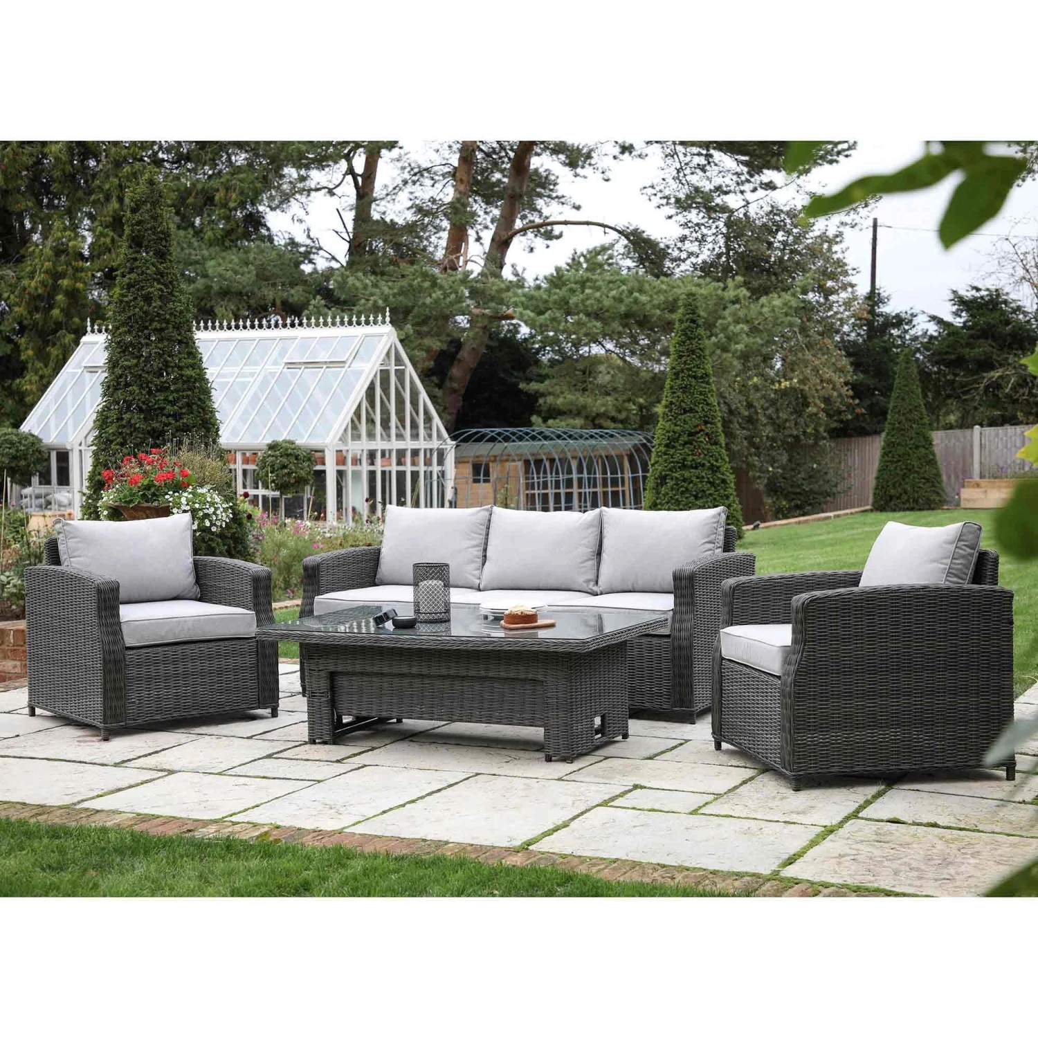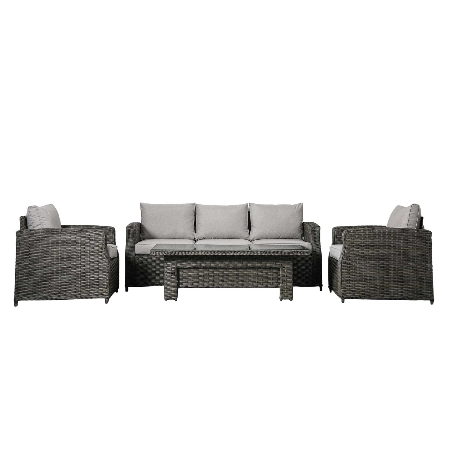 Eat and relax with this Corse Grey Rattan 3 Seater Dining Set with Rising Table. This lovely outdoor dining set features a 3-seater sofa, two armchairs and a riser table, ideal for guests anytime of the day! The innovative design dining table can be lowered and used as a coffee table or raised as a dining table! All pieces are crafted with 5mm thick PE rattan with a hand woven mixed half round/full round weave and washed grey finish. The table is fitted with a tempered glass top and showerproof cushions are included with the chairs for maximum comfort.