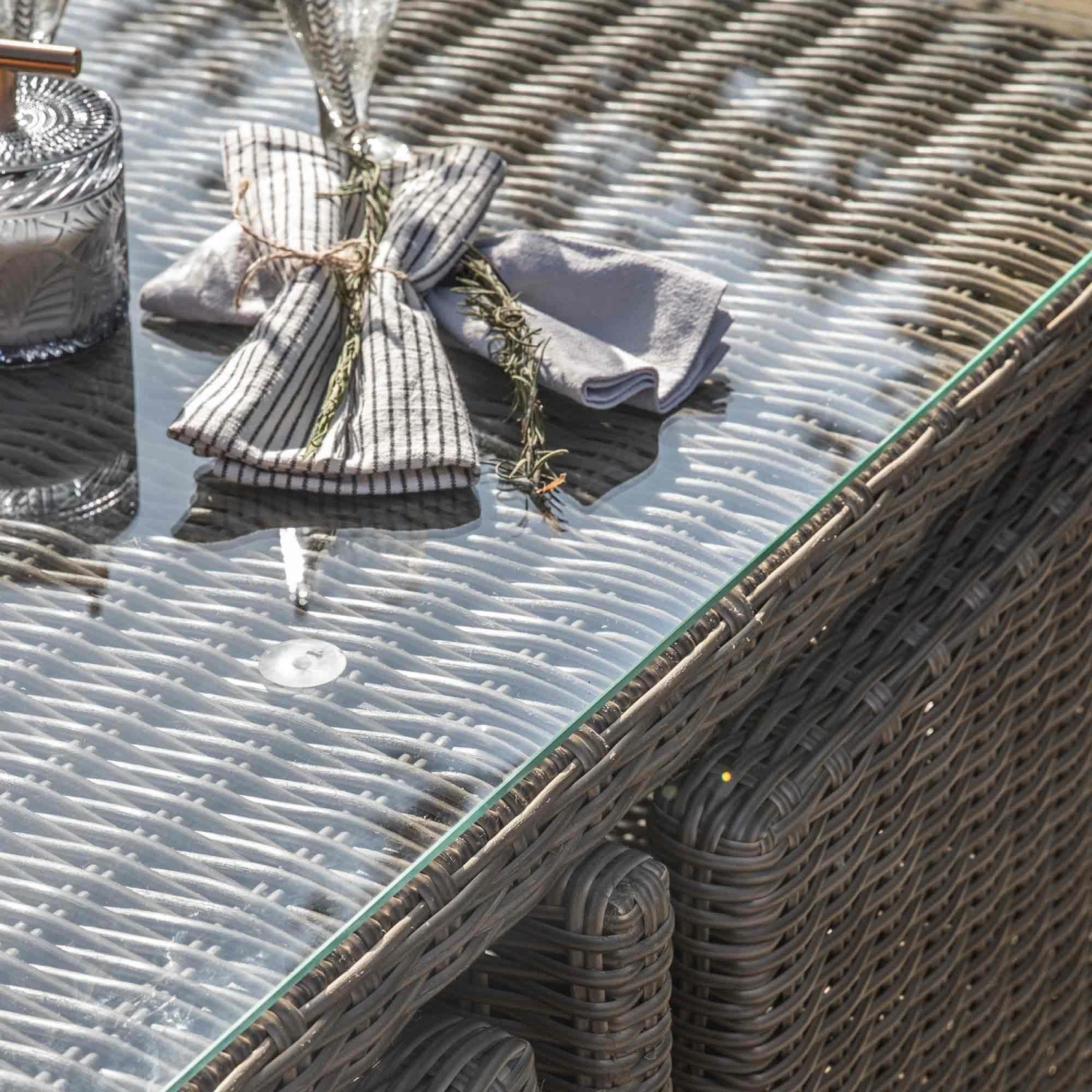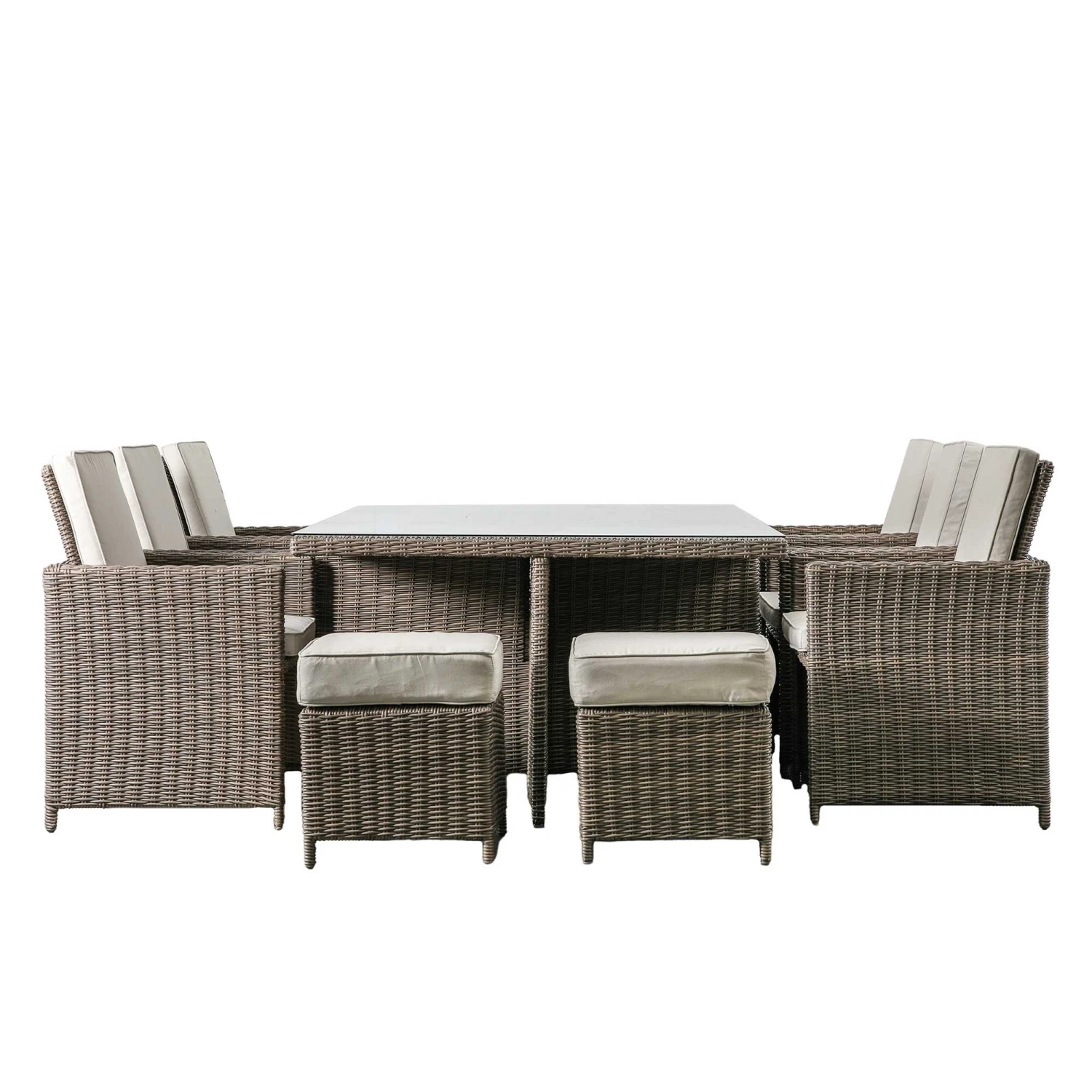 Comfortably seat up to 10 people with this Corse Natural Rattan 10 Seater Cube Dining Set! Featuring six dining chairs, six stools and a dining table, this rattan furniture set is made to withstand all weathers with its thick 5mm PE rattan and hand woven mixed half round/full round weave. The chairs and stools are complete with showerproof cushions in a complimenting soft neutral tone. The backs of chairs fold down, allowing all chairs and stools to be stored under the table when not in use. The table is finished with a tempered glass top and powder coated aluminium frame.