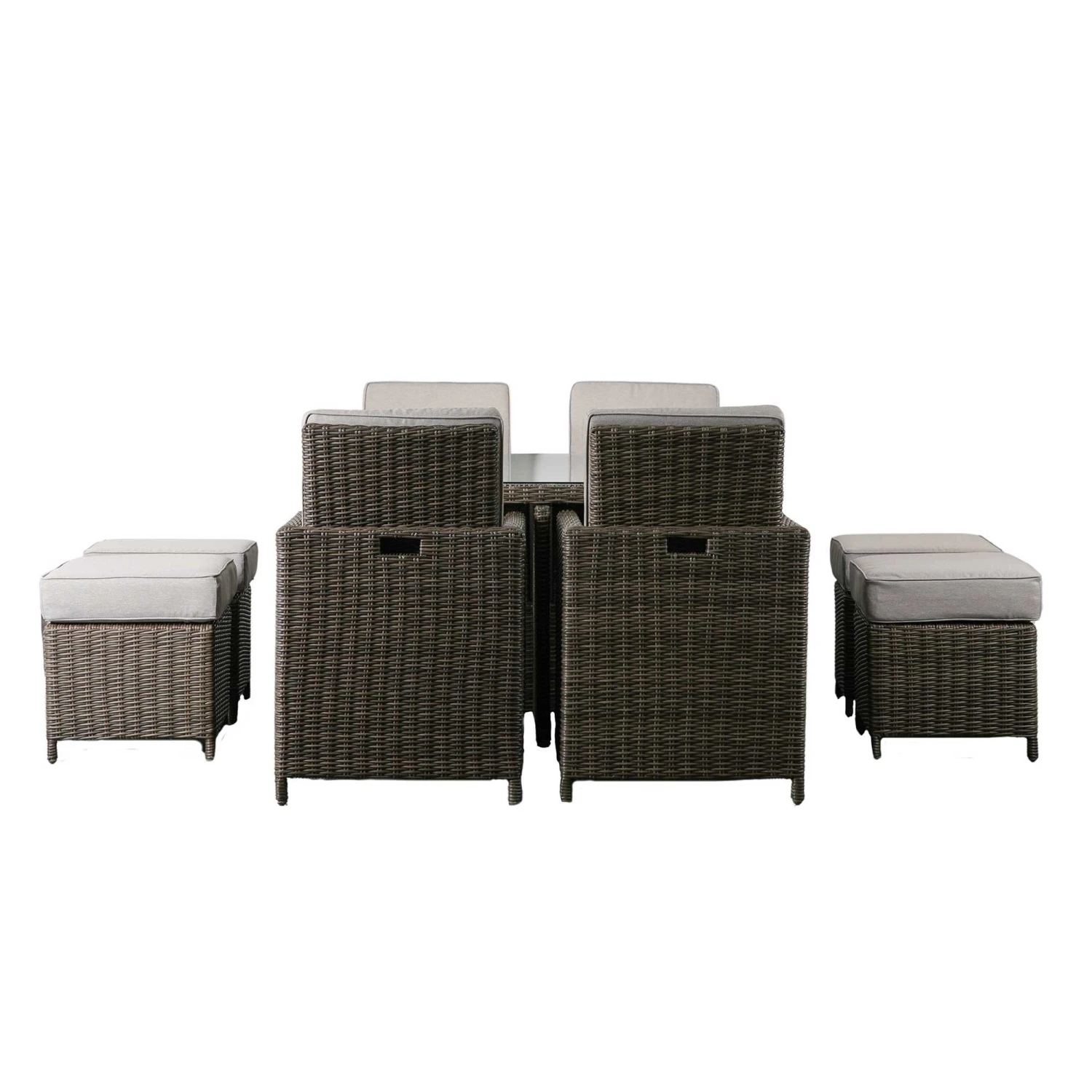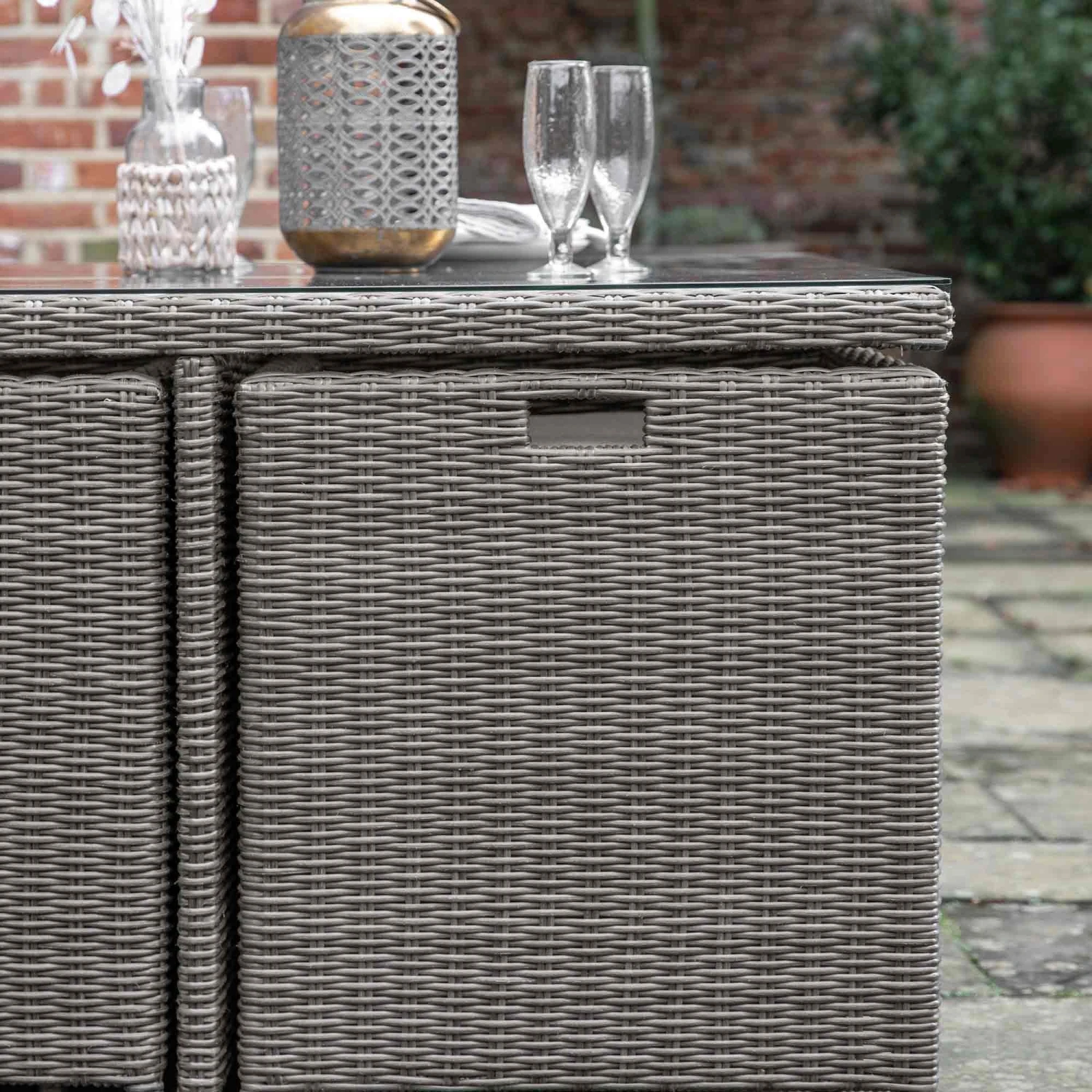 Complete your garden furniture with this stunning Corse Natural Rattan 8 Seater Cube Dining Set! This outdoor dining set includes four dining chairs, four stools and a dining table, all made with 5mm PE rattan for quality made to last. The full set is finished with a hand woven mixed half round/full round weave and a natural coloured look, complementing any garden space. The chairs and stools provide showerproof cushions for additional comfort, as well as a neutral colour complementing the natural rattan tones. The table is complete with a tempered glass top and powder coated aluminium frames.