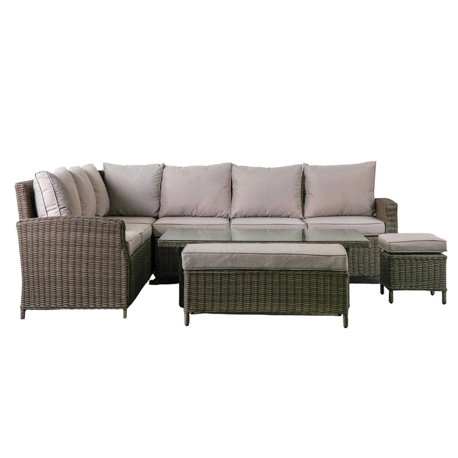 This Corse Natural Rattan Rectangle Dining Set with Rising Table is the perfect addition to any outdoor space. Complete with a corner sofa, an ottoman, a stool and a rising table, this rattan furniture set is great for eating as well as relaxing. The innovative design dining table means that it can also be lowered and used as a coffee table! All pieces are made with 5mm PE rattan, providing weatherproof properties. This dining set has a hand woven mixed half round/full round weave in a natural finish and neutral tone seat cushions for maximum comfort. The table is finished with a tempered glass top and powder coated aluminium frame.