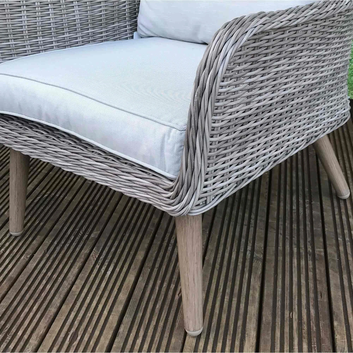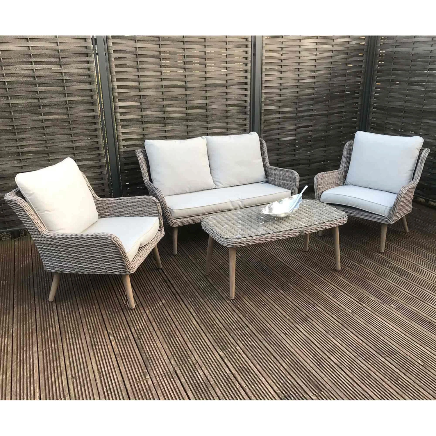 This Danielle Grey Rattan 4 Seater Sofa Set is the ideal rattan furniture set for any garden! Seating up to 4 people, this set features a 2 seater sofa, two individual chairs and a table all with matching retro style legs. This lovely sofa set will bring charm and character to your outdoor space and the pale grey cushions will compliment the grey rattan as well as any garden greenery! Made with powder coated aluminium frames and UV treated rattan.