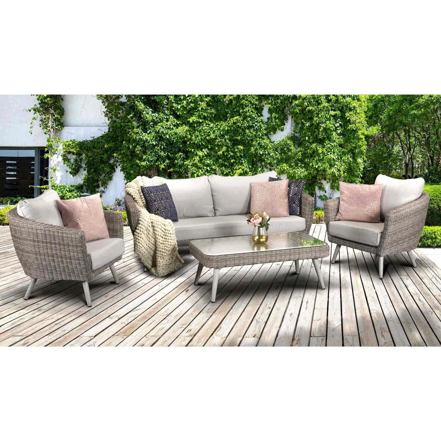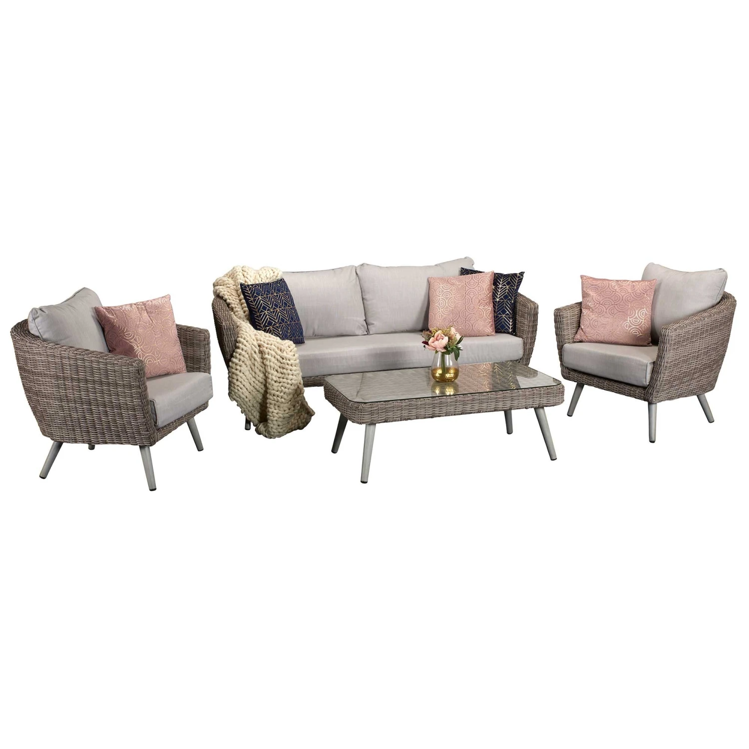 Make a difference to your outdoor setting with this fabulous Danielle Grey Rattan 5 Seater Sofa Set! With this grey rattan sofa set, you will be able to host garden parties and enjoy the outdoors with a group of up to 5 people! This beautiful outdoor set is finished in grey rattan with complimentary pale grey cushions, bringing your garden to life! Made with UV treated rattan and powder coated aluminium frames for a strong and robust build.