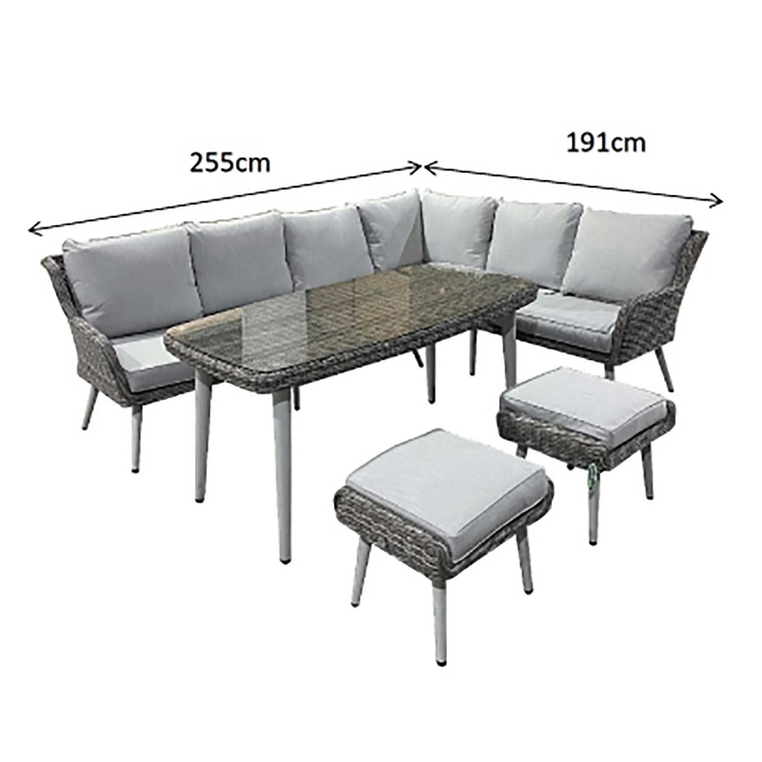 Great for socialising and dining outdoors, this Danielle Grey Rattan Corner Sofa Dining Set is perfect for any garden! Made from high quality UV treated rattan, this outdoor furniture set is finished in fine grey and complete with grey cushions. This corner sofa set will make the perfect addition in any garden corner, enabling friends and family to gather round nicely. Includes two ottomans and a glass top table. Ideal for all weather conditions.