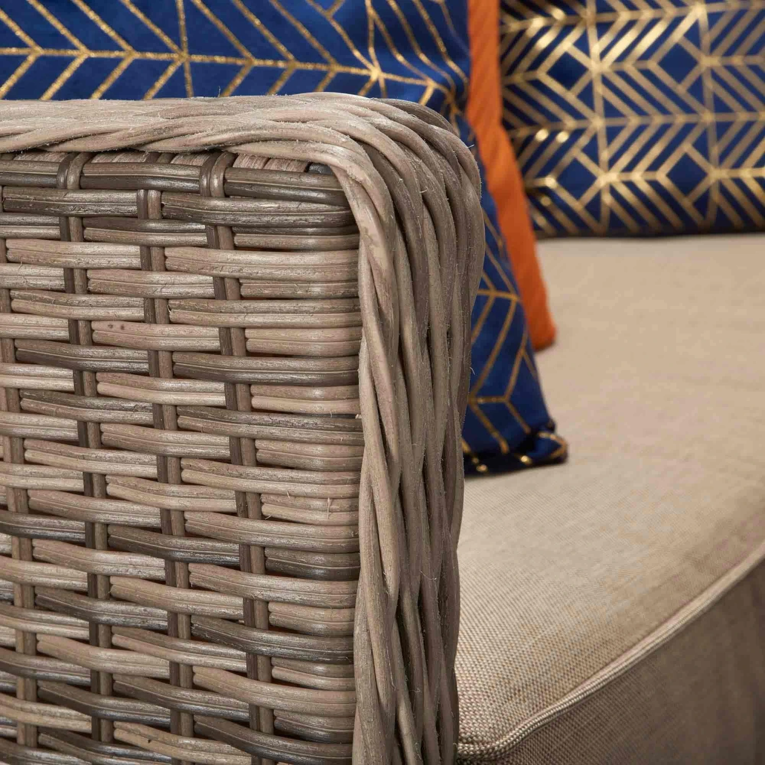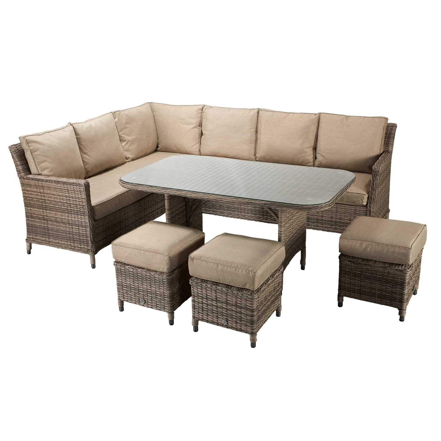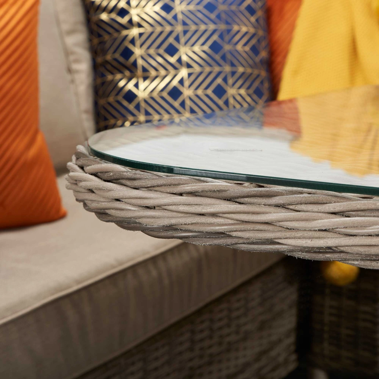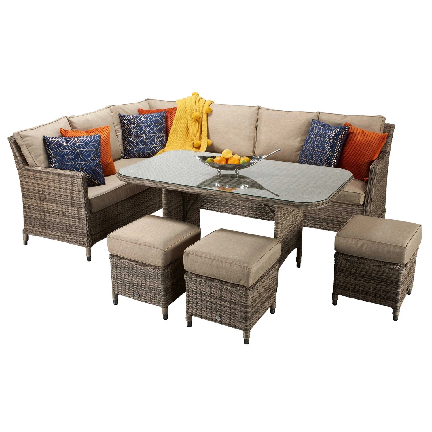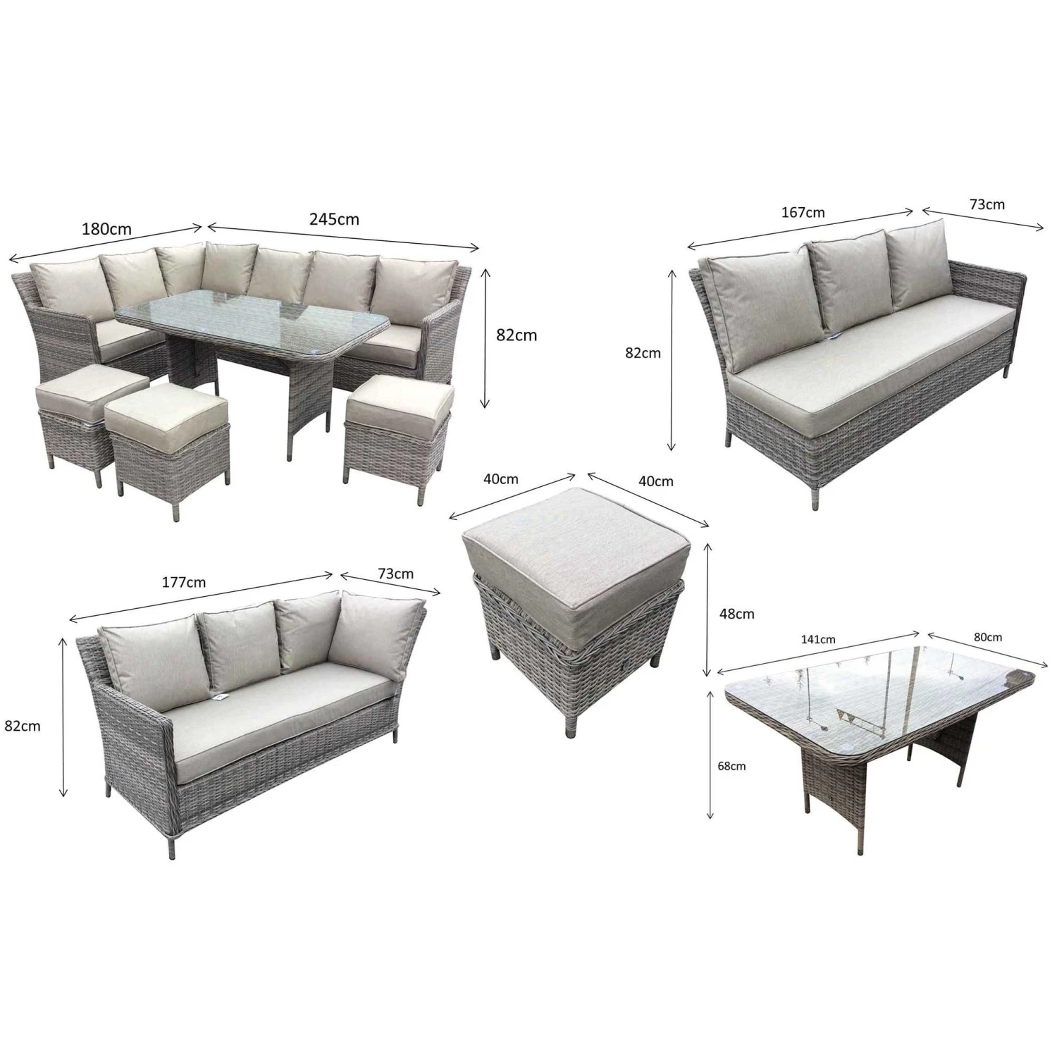 Make the most of the outdoor weather and enjoy dining outside with this Edwina Natural and Grey Rattan Corner Sofa Dining Set! This rattan furniture set features a stunning appearance, made with a mixed Natural and Grey weave. The high strength powder coated aluminium frames and UV treated rattan guarantees this set will withstand any weather condition and will last for years to come. Includes 3 ottoman stools and glass top table.