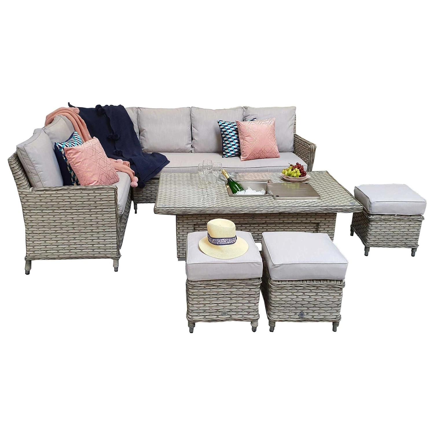 Add the finishing touch to your garden with this Edwina Special Grey Rattan Corner Sofa Dining Set with Lift Table! Ideal for seating friends and family, this outdoor furniture set is the ideal piece of furniture to complete your garden. This rattan set is made from UV treated rattan and powder coated aluminium frames to withstand all weather conditions. The main feature of this set is the lift table with a stunning ice bucket hole to keep drinks cool in hot weather!
