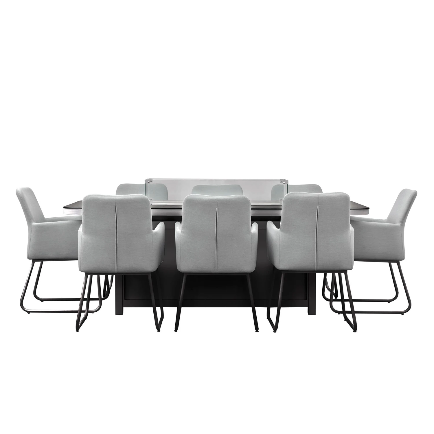 The Elba 8 Seater Dining Set with Fire Pit Table Slate will add a luxury feel to your garden. The bar set comes in a contemporary design in grey slate. The table features a high design with a glass top and a ceramic effect finish, complete with a bioethanol fire pit in the centre to keep you warm on chilly summer nights. The base of the table comes with a door so you can storage things underneath the table. The table comes with 8 seat with a grey all-weather fabric for quick drying, which is resistant from fading, stains and mould.