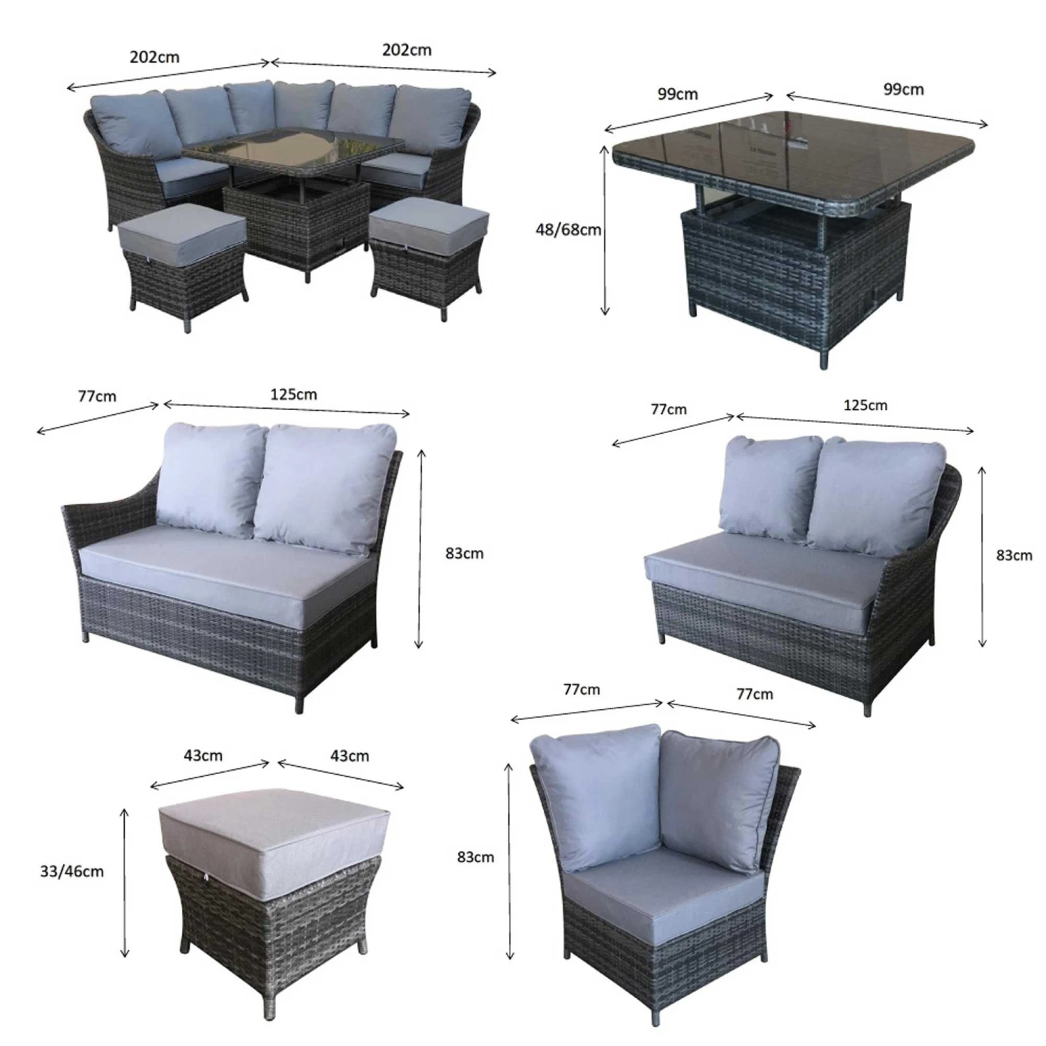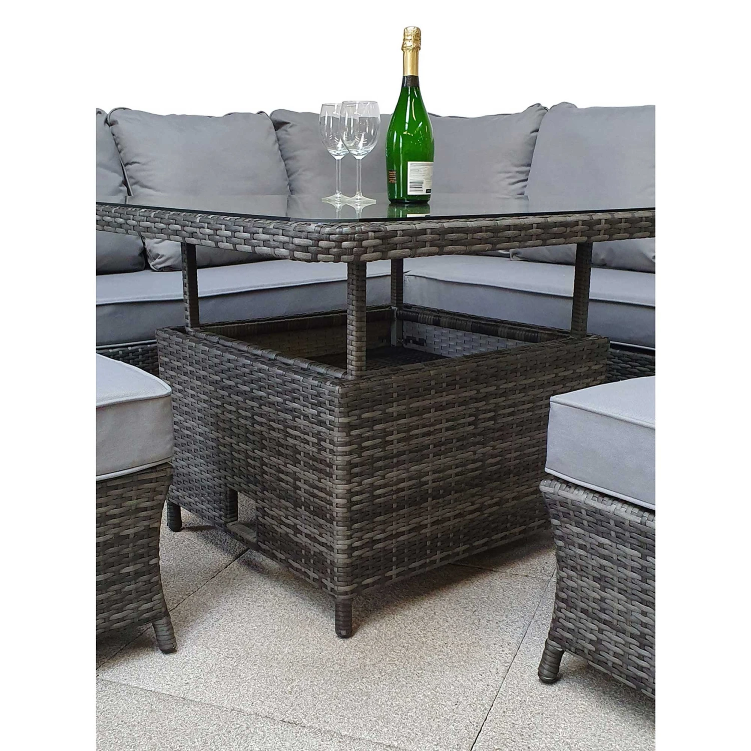 Get seated under the scorching hot sun with this Francesca Grey Rattan Corner Sofa Dining Set with Lift Table! Ideal for families and friends, this corner dining set features a corner sofa, two ottoman stools and a gas lift table providing adjustable height! This outdoor dining set is made with grey 8mm flat weave rattan for a luxurious finish.