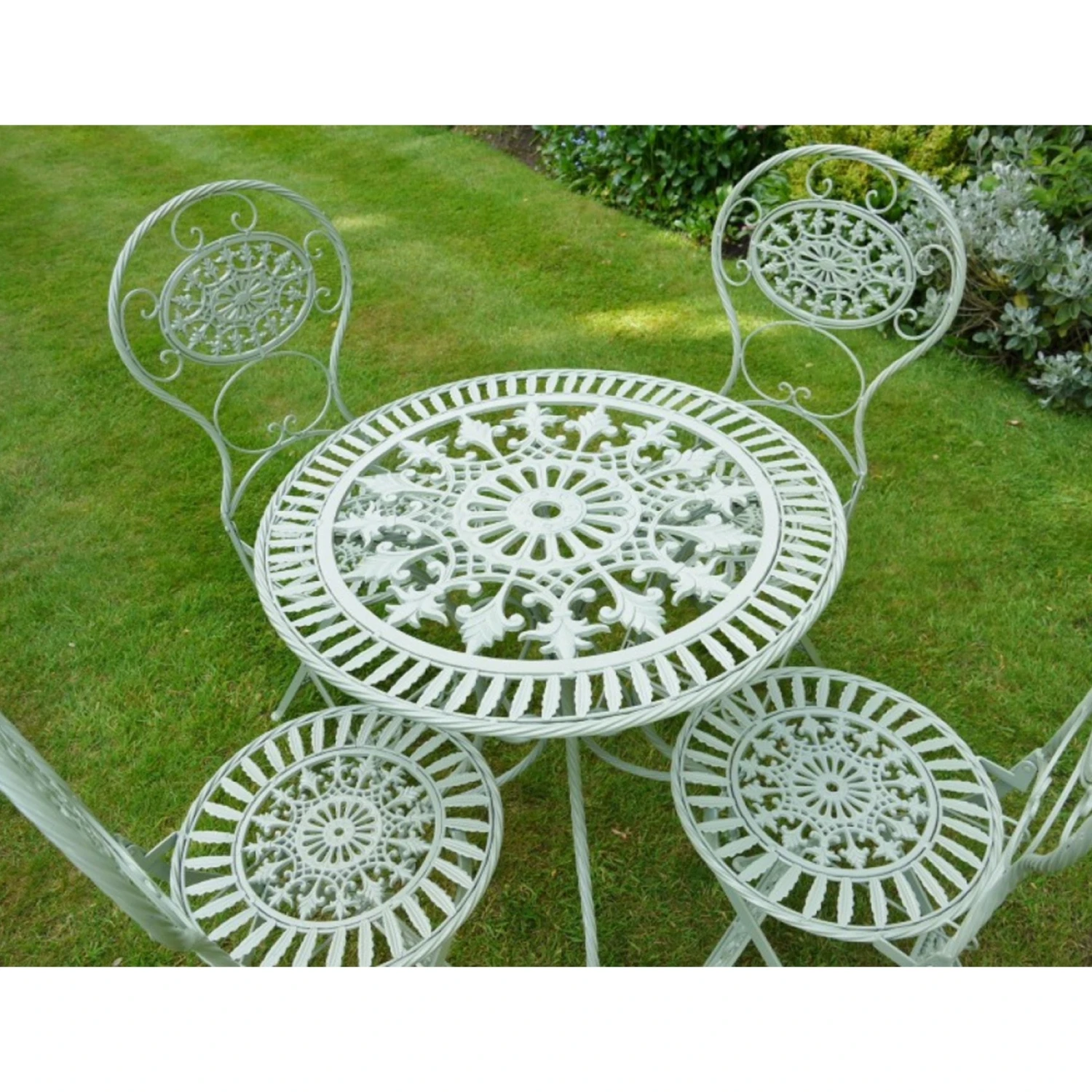Add a splash of indulgence to your garden with this 5 piece, French table and chairs set. The luxury patterned design is set in mint green and is both sturdy and stylish. Perfect for those summer evenings.
