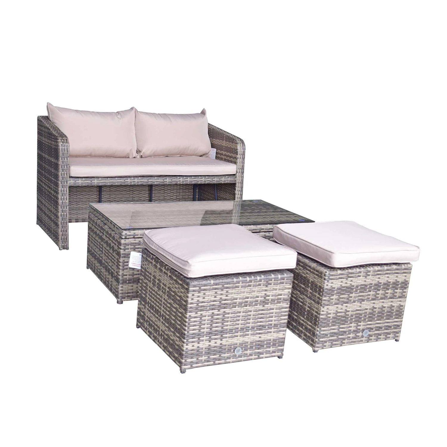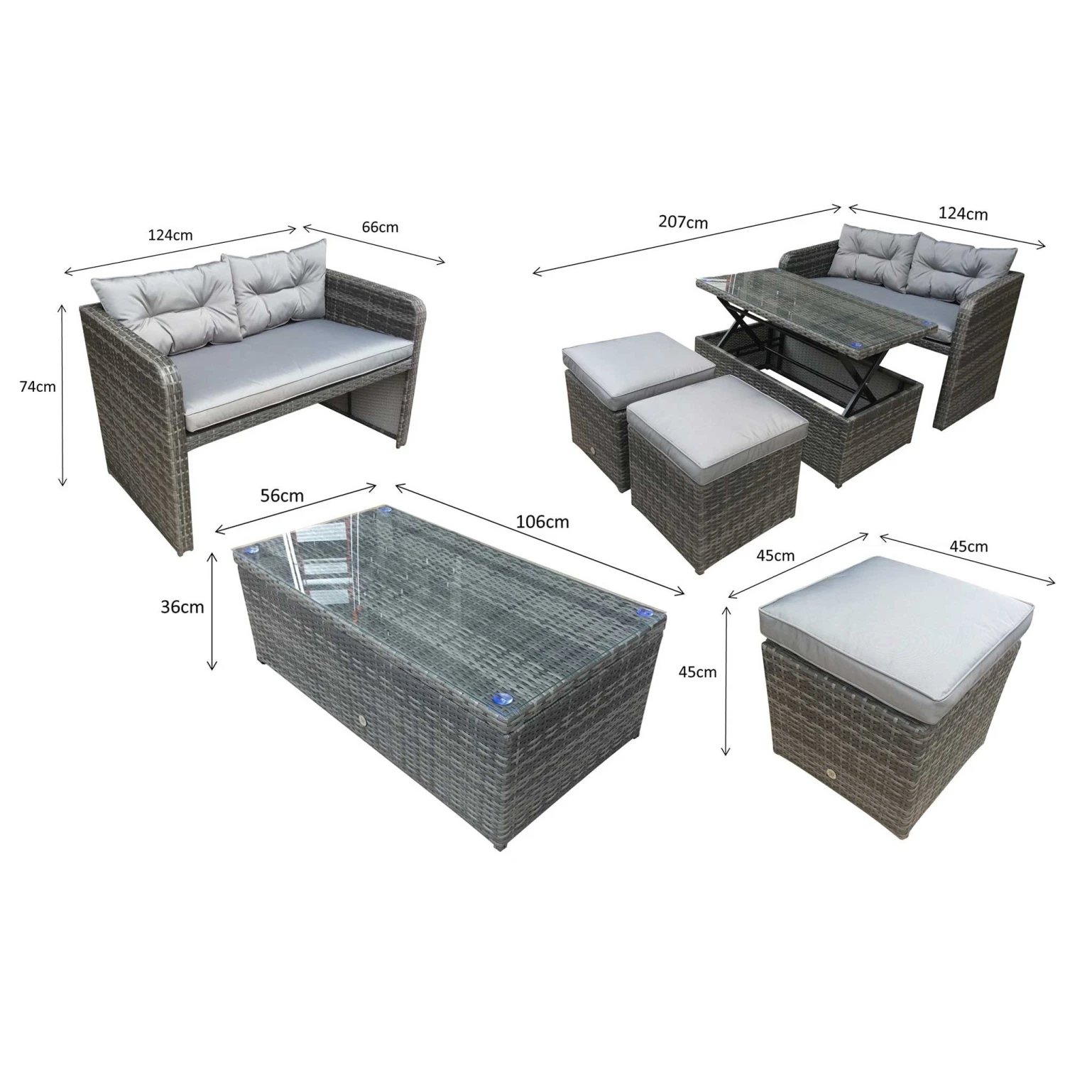 The Gemma Brown Rattan Compact Sofa Set with Lift Table is perfect for if the garden is too small for the large corner sofas. Still enough seating to go around this is perfect for family gatherings, social occasions and celebrations. Able to comfortably seat enough people complete with comfortable scatter cushions. These should be stored in a dry are when not in use. The glass table should also be covered in extreme heat.