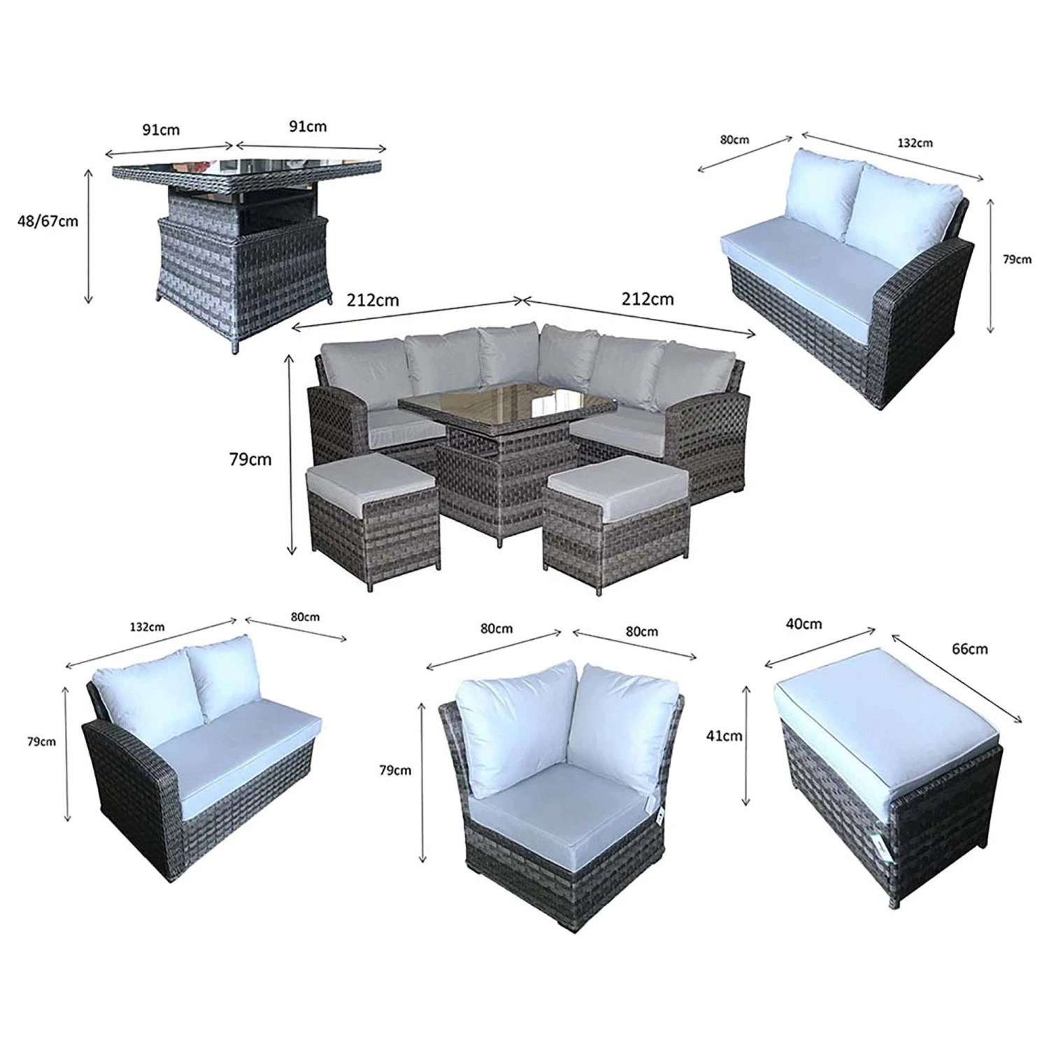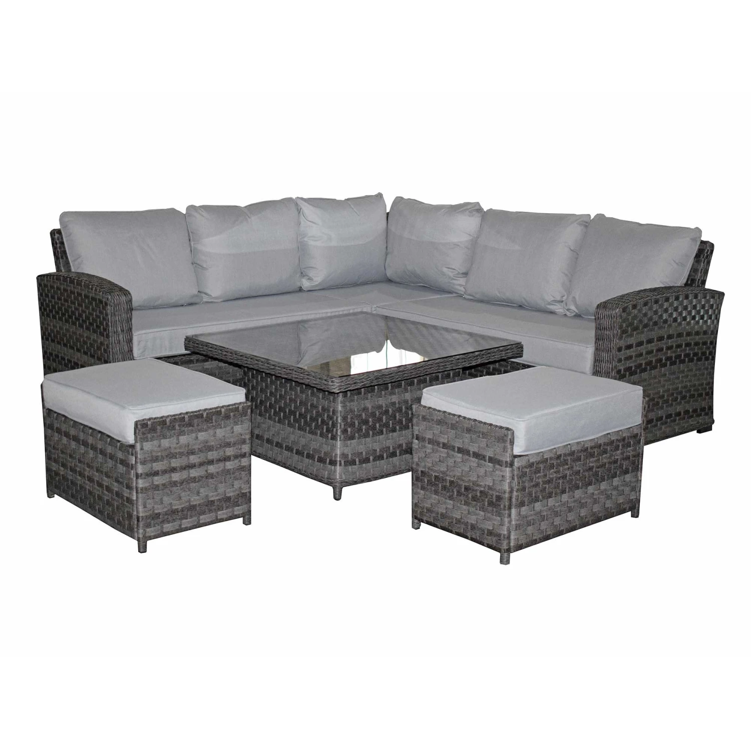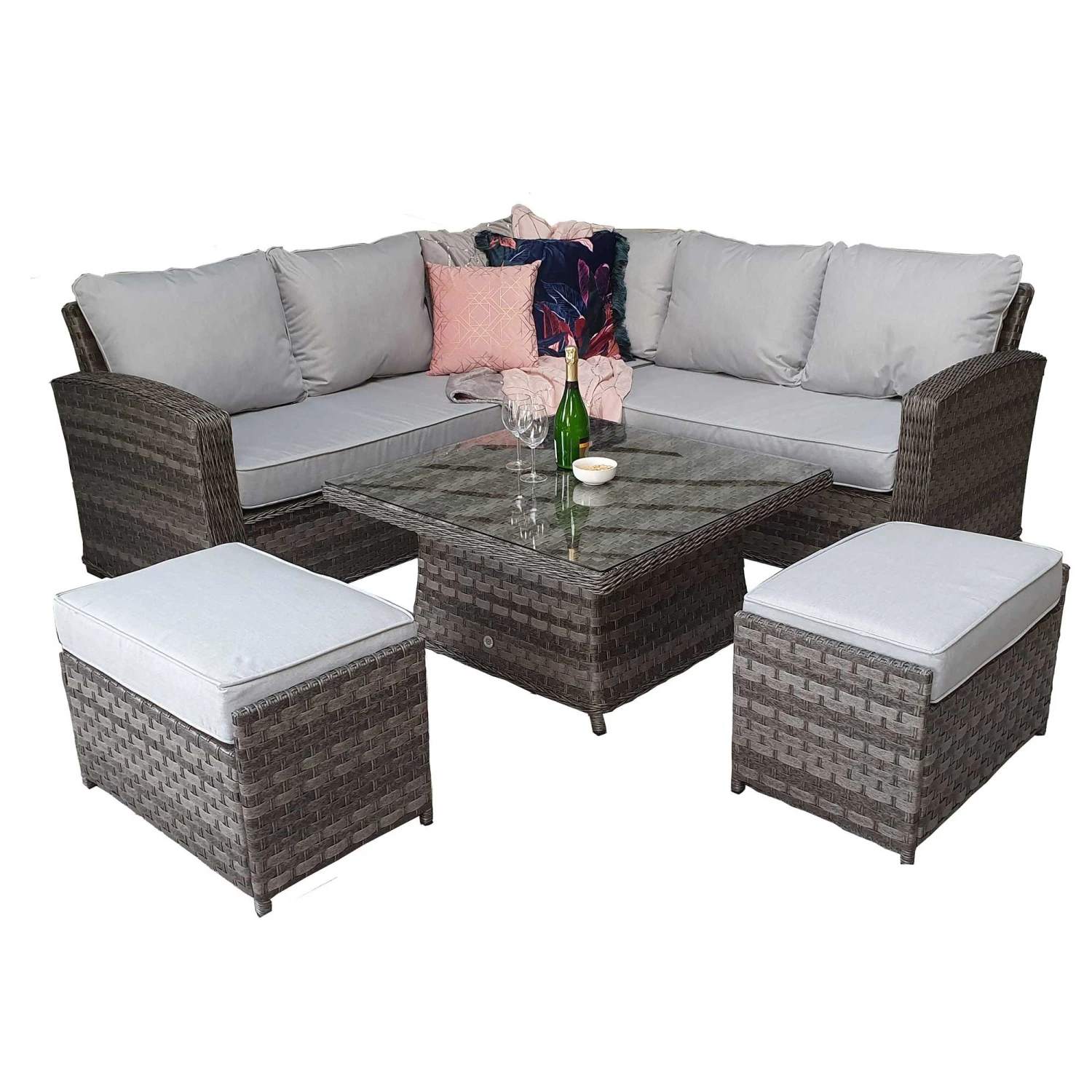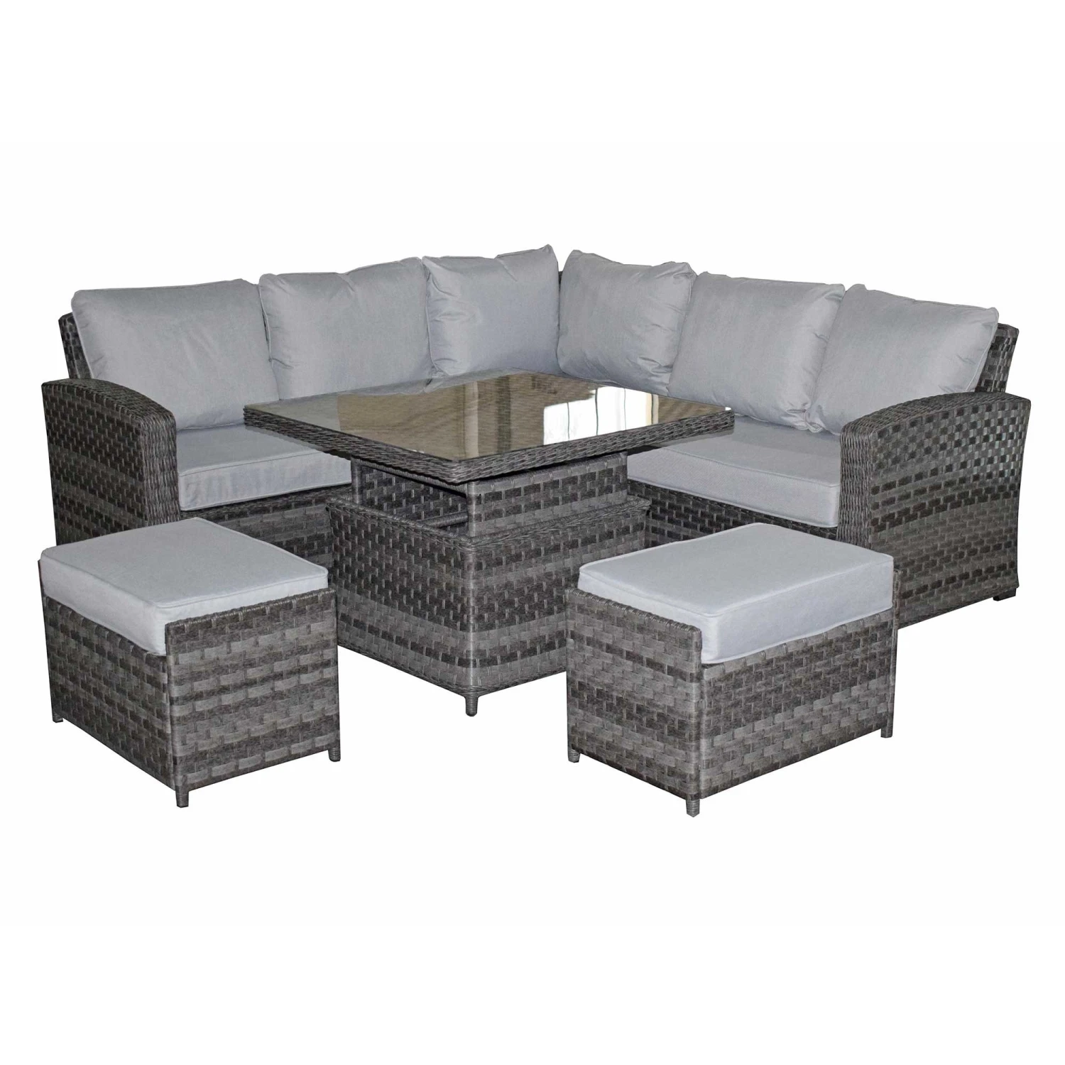 The Grace Grey Rattan Corner Sofa Dining Set with Lift Table is a must in any modern garden. There is enough seating to go around for friends and family to come and visit and even stay for a barbeque blow out. The table is even extendable turning it from a coffee table into a dining table! All cushions should be stored in a dry area and cover the glass table in extreme heat.