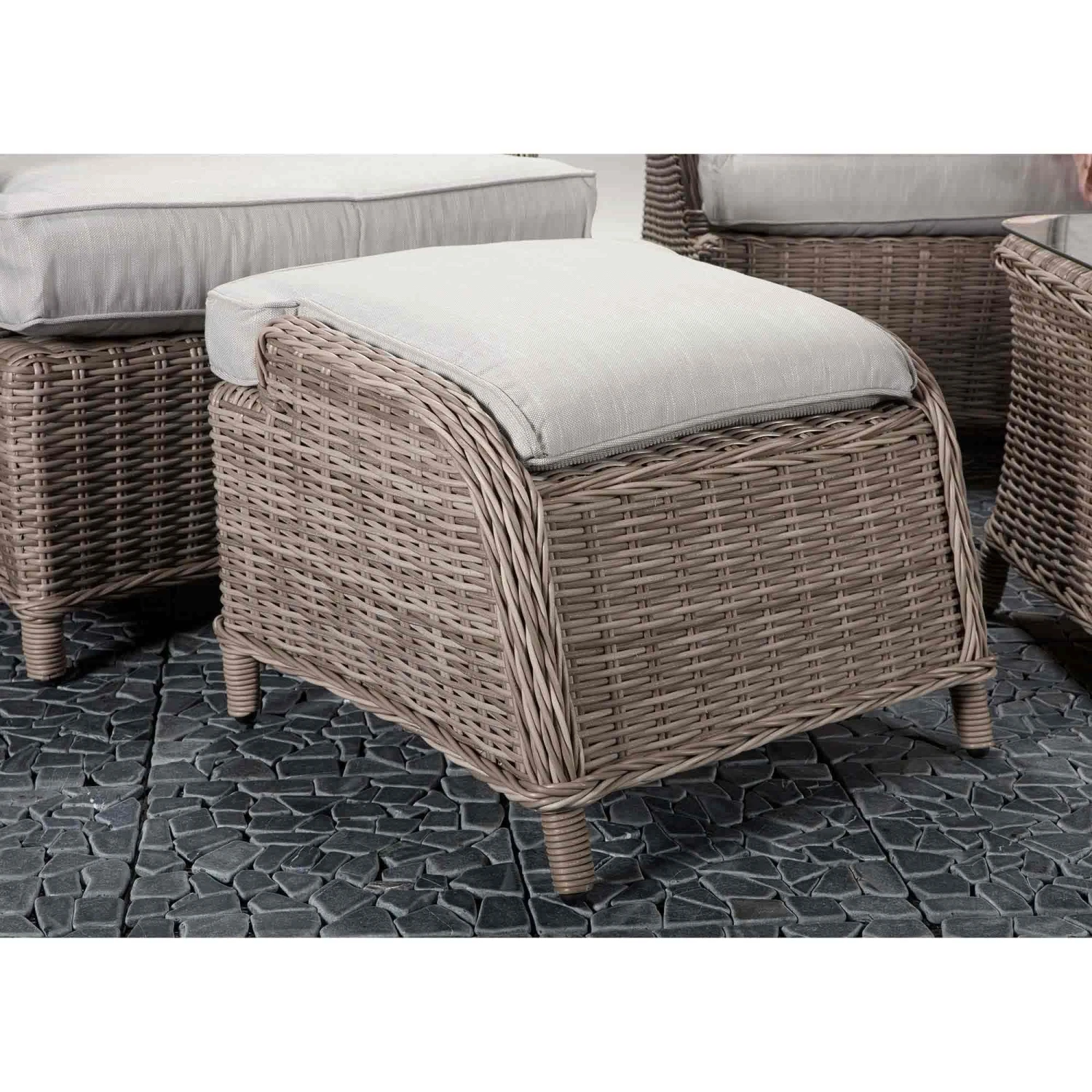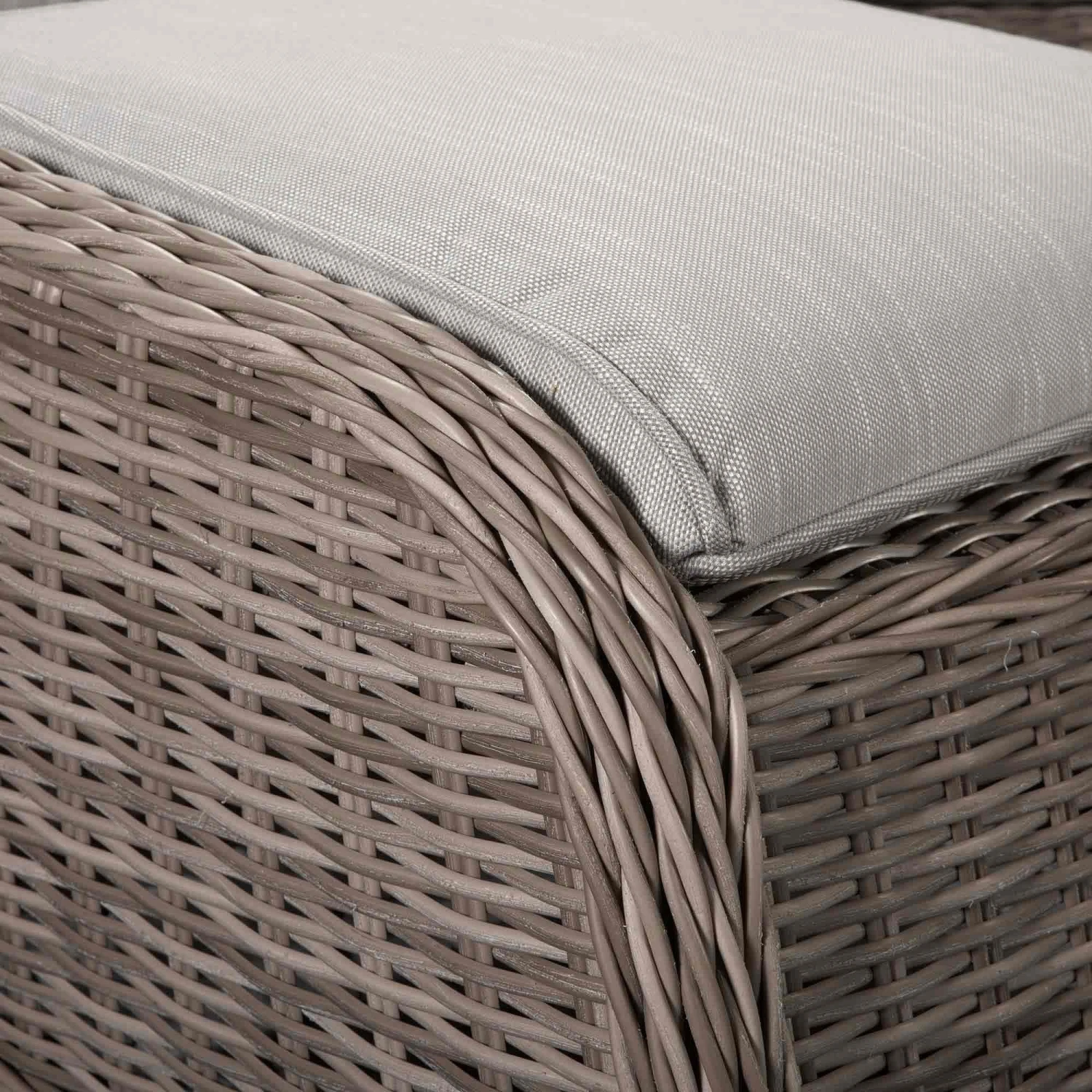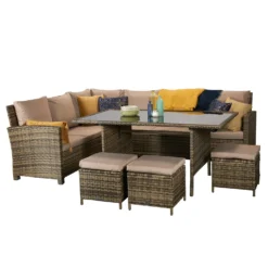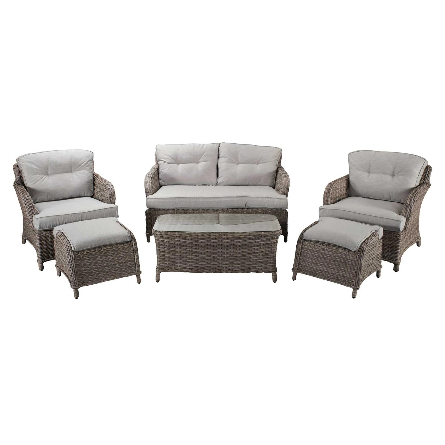 The Harriet Grey Rattan 4 Seater Sofa Set would be a great way to get the family round for barbeques featuring a luxurious garden sofa 2 chairs complete with footstools and a glass surface table for resting drinks on. Cushions should be kept in a dry area when not in use and the glass table should be covered in extreme heat.