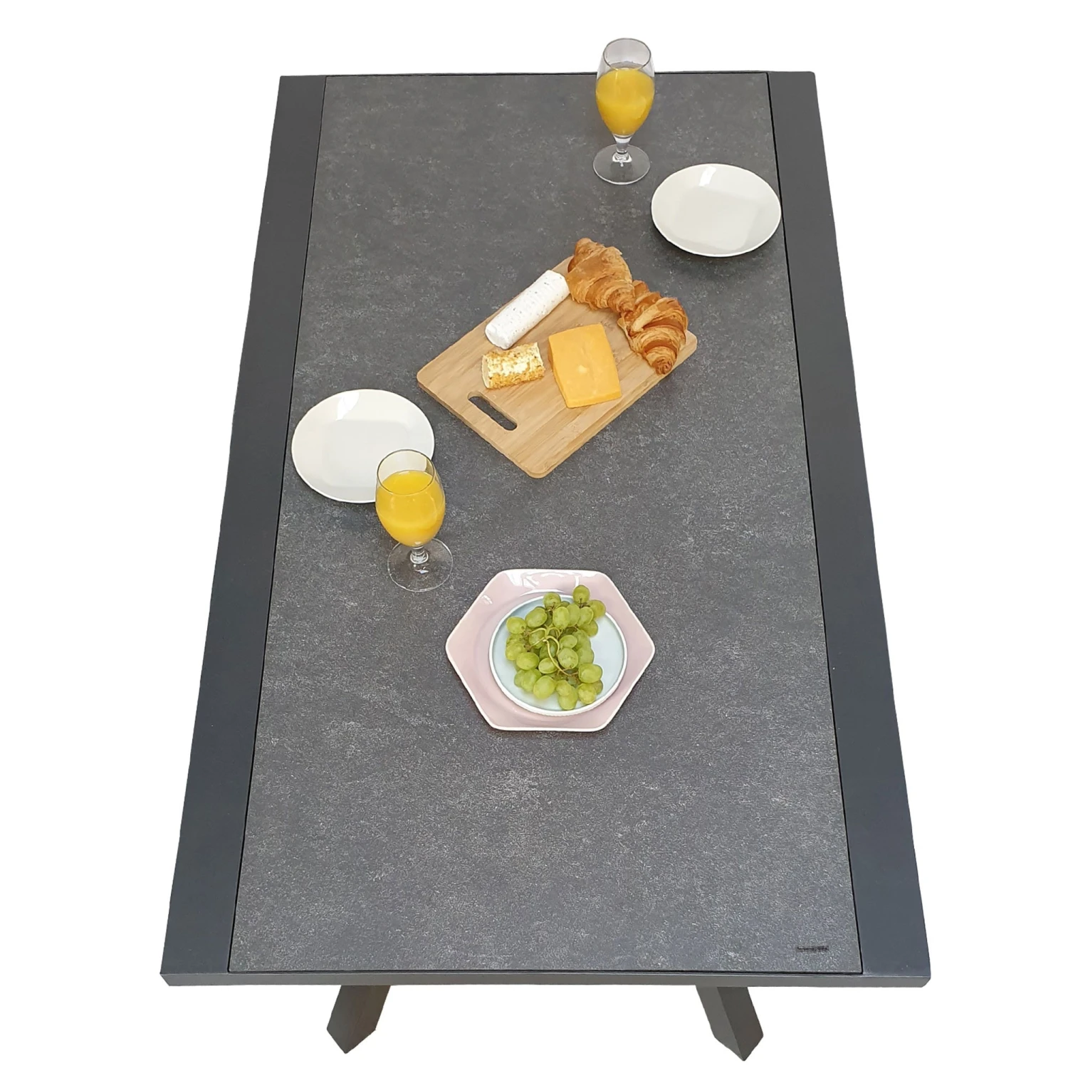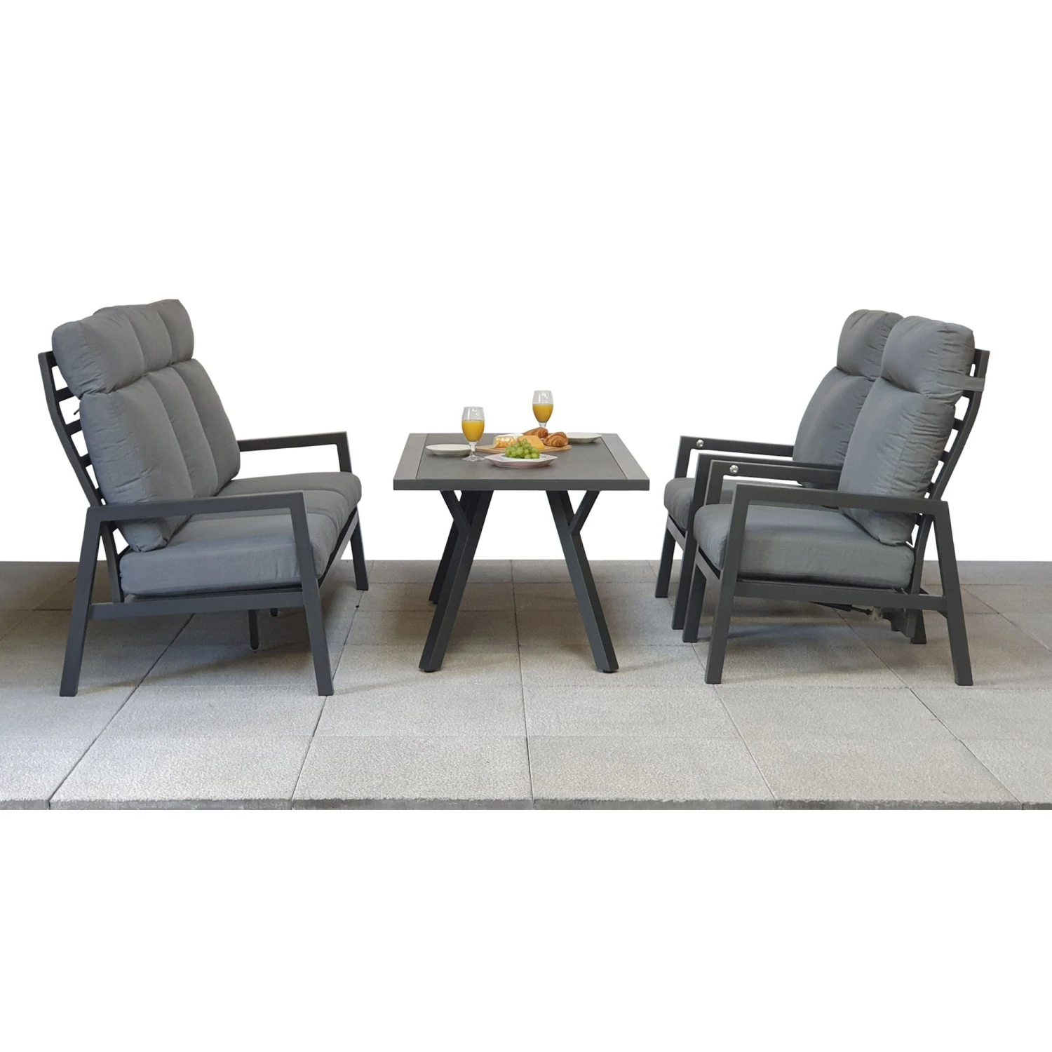 Dine in your garden or outdoor space in style with this stunning Kimmie Grey Aluminium 5 Seater High Back Sofa Dining Set. The seat features a 2 seater sofa and 2 chairs crafted with a dark grey powder coated aluminium frames and topped with grey padded cushions and backrests for extra comfort. The 2 chairs feature a reclining design for the ultimate comfort. This stylish set come with a matching white table that is topped with a glass panel. The cushions are showerfroof and can be wipe clean when needed.