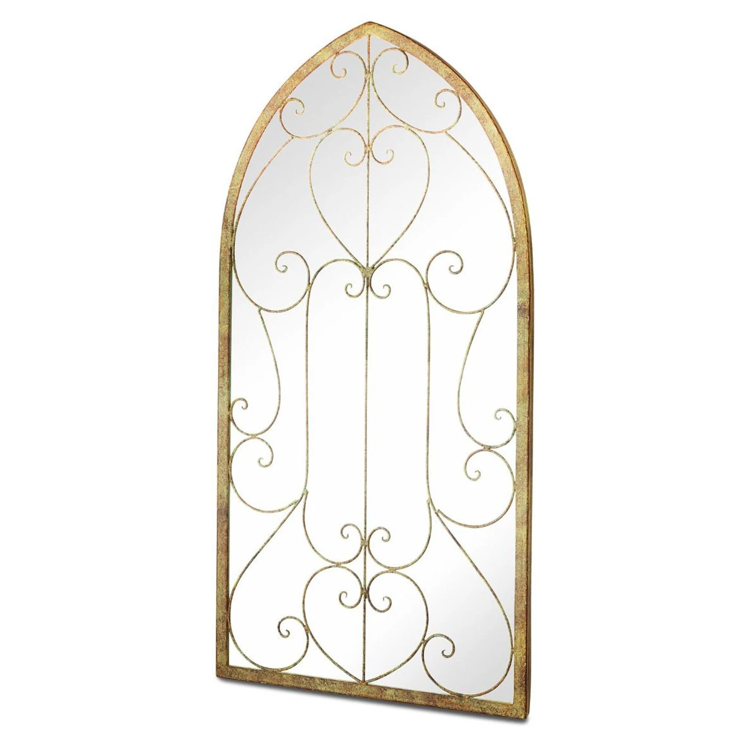 The Kirkby Metal Arch Shaped Decorative Window Garden Mirror would be a wonderful addition to the home or garden. Its interesting slightly rustic window pane design is made from metal and finished in a gleaming gold. Frost protected so can be hung outside all year long.