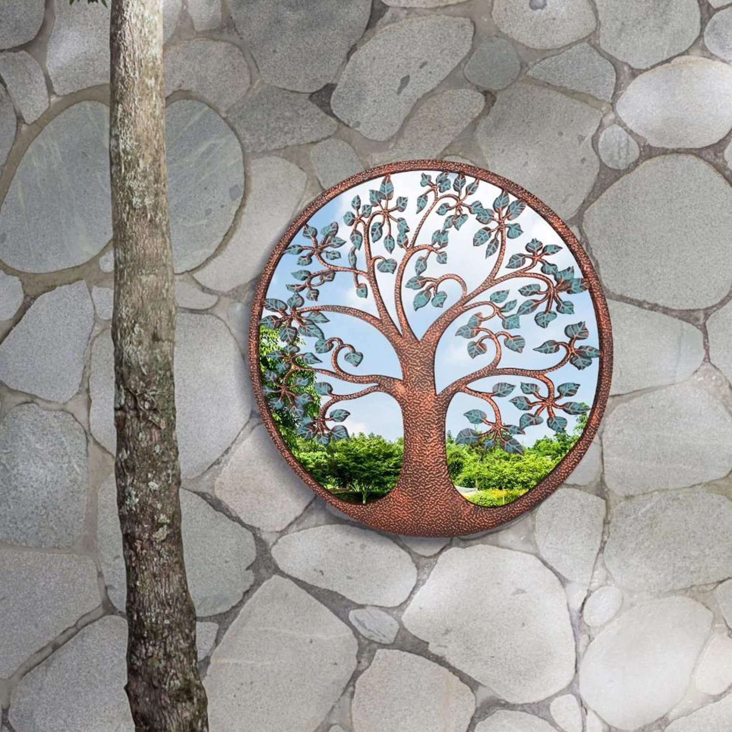 The Kirkby Metal Circular Decorative Colour Tree Garden Mirror Outdoors would be an impressive addition the home due to the interesting rustic metal design which can be placed outside or in. Cleverly depicting a tree design over the mirror which is complete with luscious branches and birds. Frost protected so can be hung outside all year long!