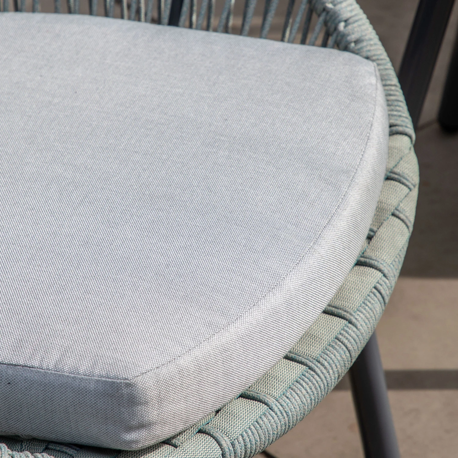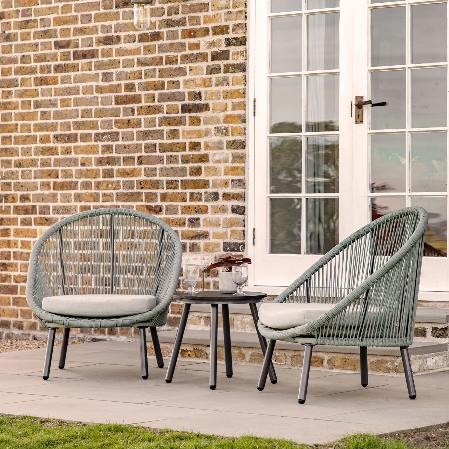 Adding a rustic charm to your garden with this Lamezia Sage 2 Seater Bistro Set, the perfect addition to a small garden or patio. The charming designed set comes with 2 chairs in a low design, crafted with a woven sage rope design and topped with showerproof comfy grey cushions. The set also features a small wooden table for the perfect place to rest your drinks or books whilst your relax in the sunshine.