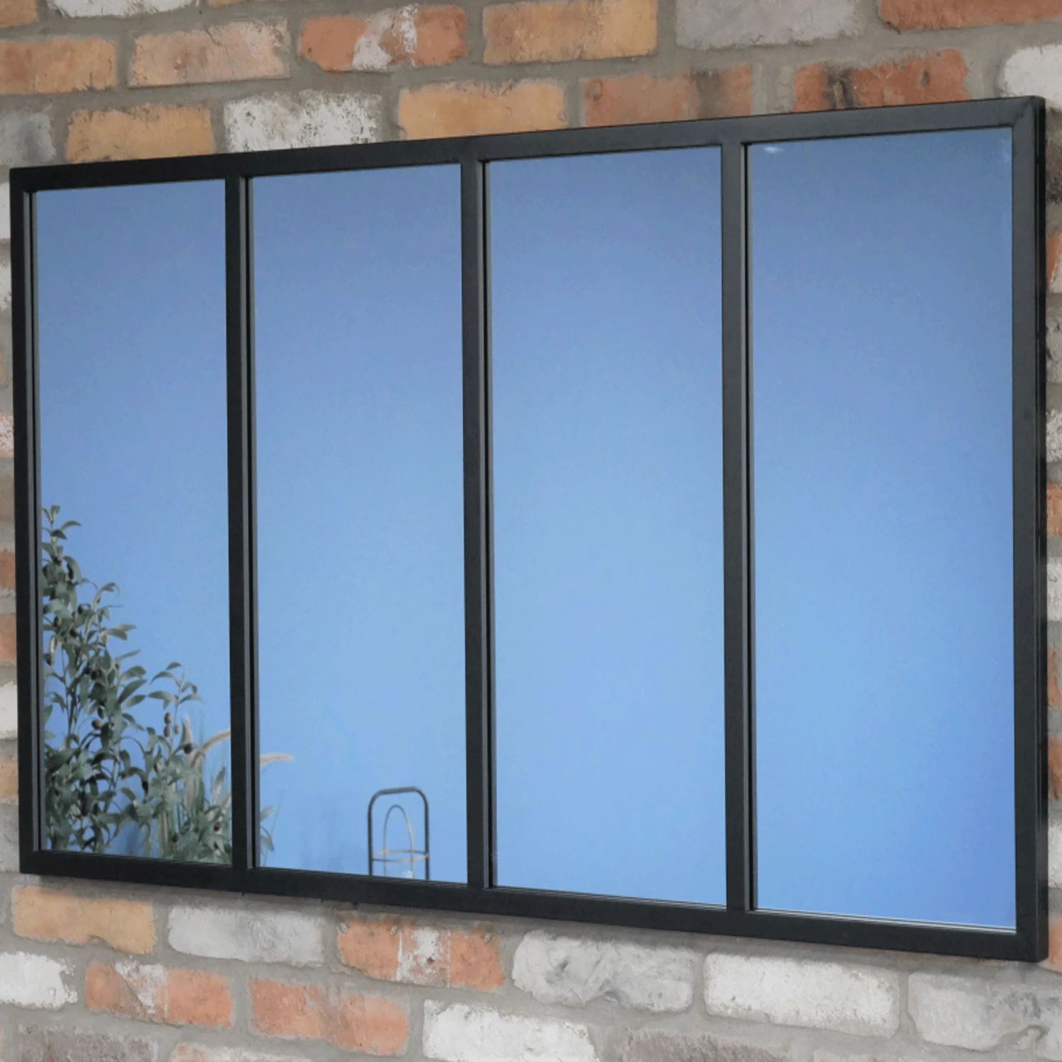 A traditional rectangular, large black framed industrial mirror, suitable for those with a modern home interior. A simple design with its solid black metal frame gives the illusion of there being 4 portrait mirrors. This modern mirror would look good above the sofa in the living room to catch people’s attention as they come in. A standard style industrial mirror that is a must for any home.