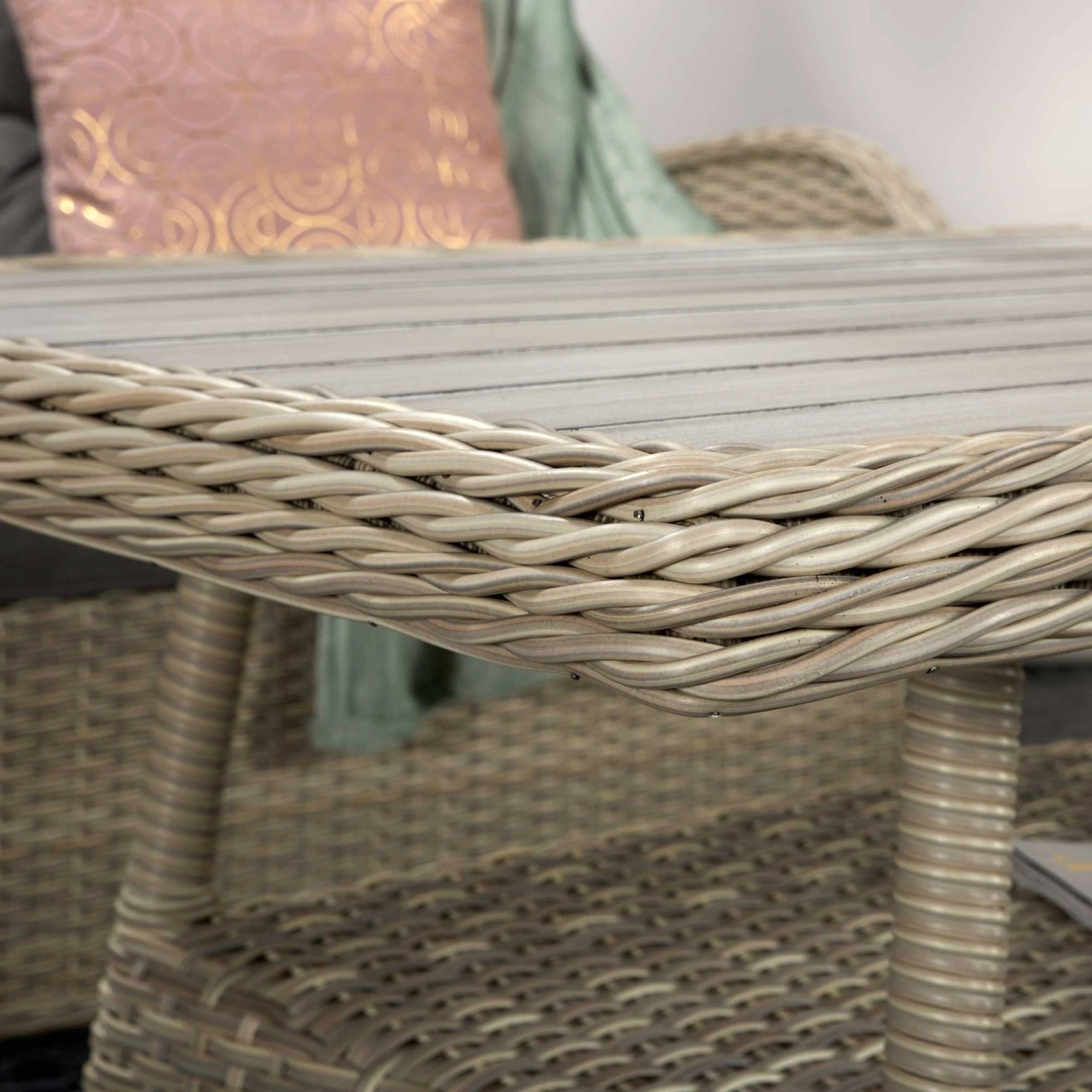 The Meghan Cream Grey Rattan 4 Seater Sofa Set with Supper Table would be impressive for when the friends and family come over with a table to place drinks on and somewhere to collectively sit. This could be when having a barbecue or sitting in the sun playing card games. Cushions should be placed in a dry area when not in use and coasters should be used on the table to avoid scuffs and marks.