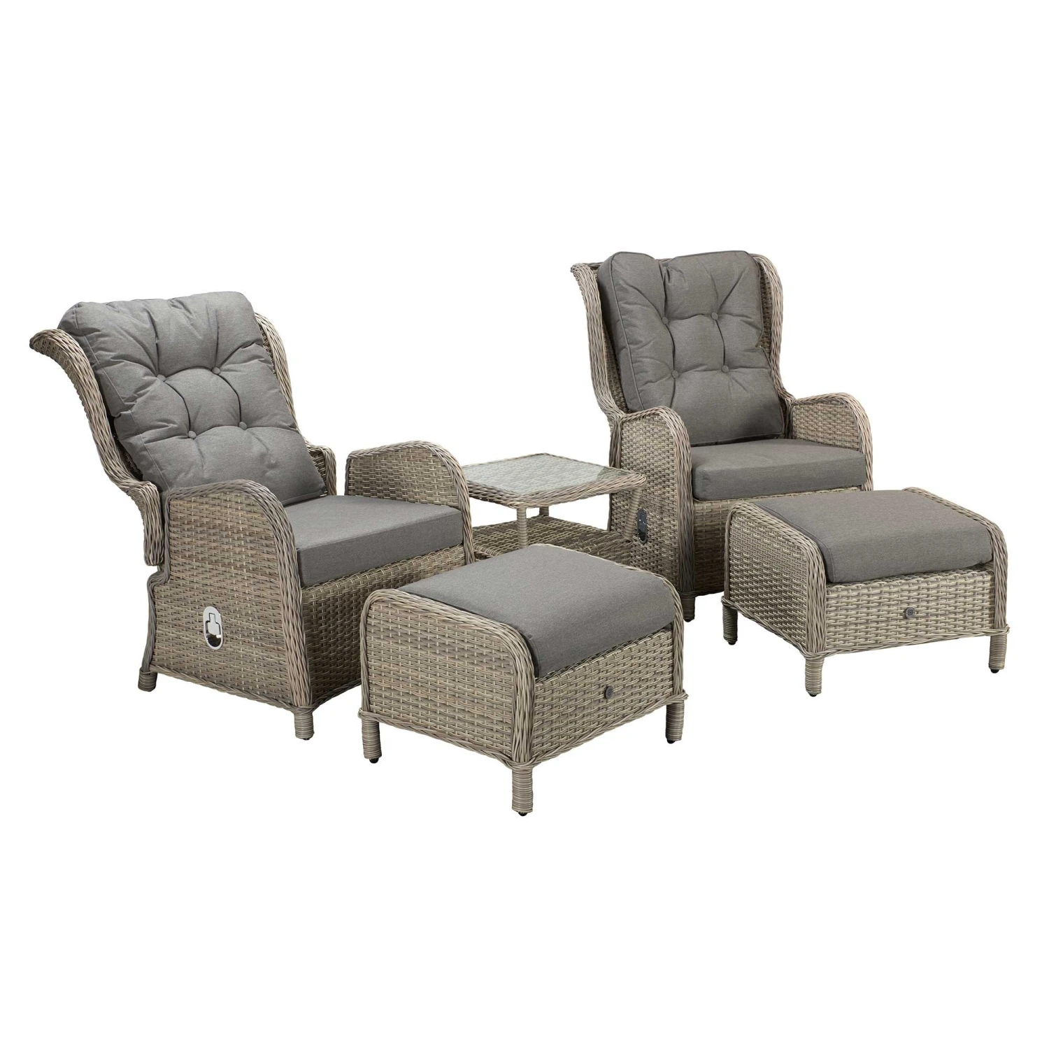 Why not introduce some stylish seating to the garden with the all new Meghan Cream Grey Rattan Reclining Lounge Set. A pair of chairs have a footstool each to easily foot your feet up with a cocktail in end which then can be replaced on the aluminium topped table. Complete with scatter cushions which should be put in a dry area when not in use. Can be washed with running water.