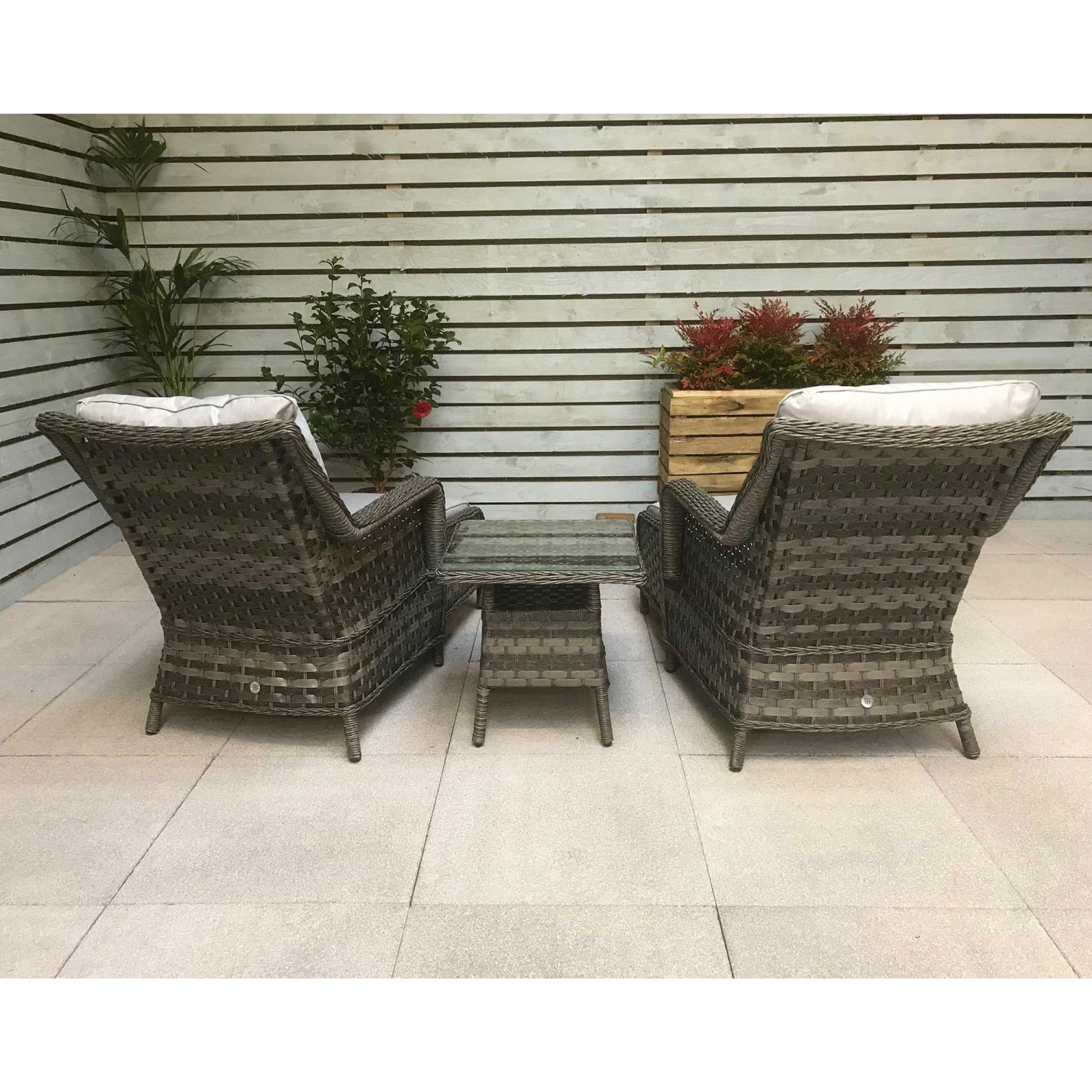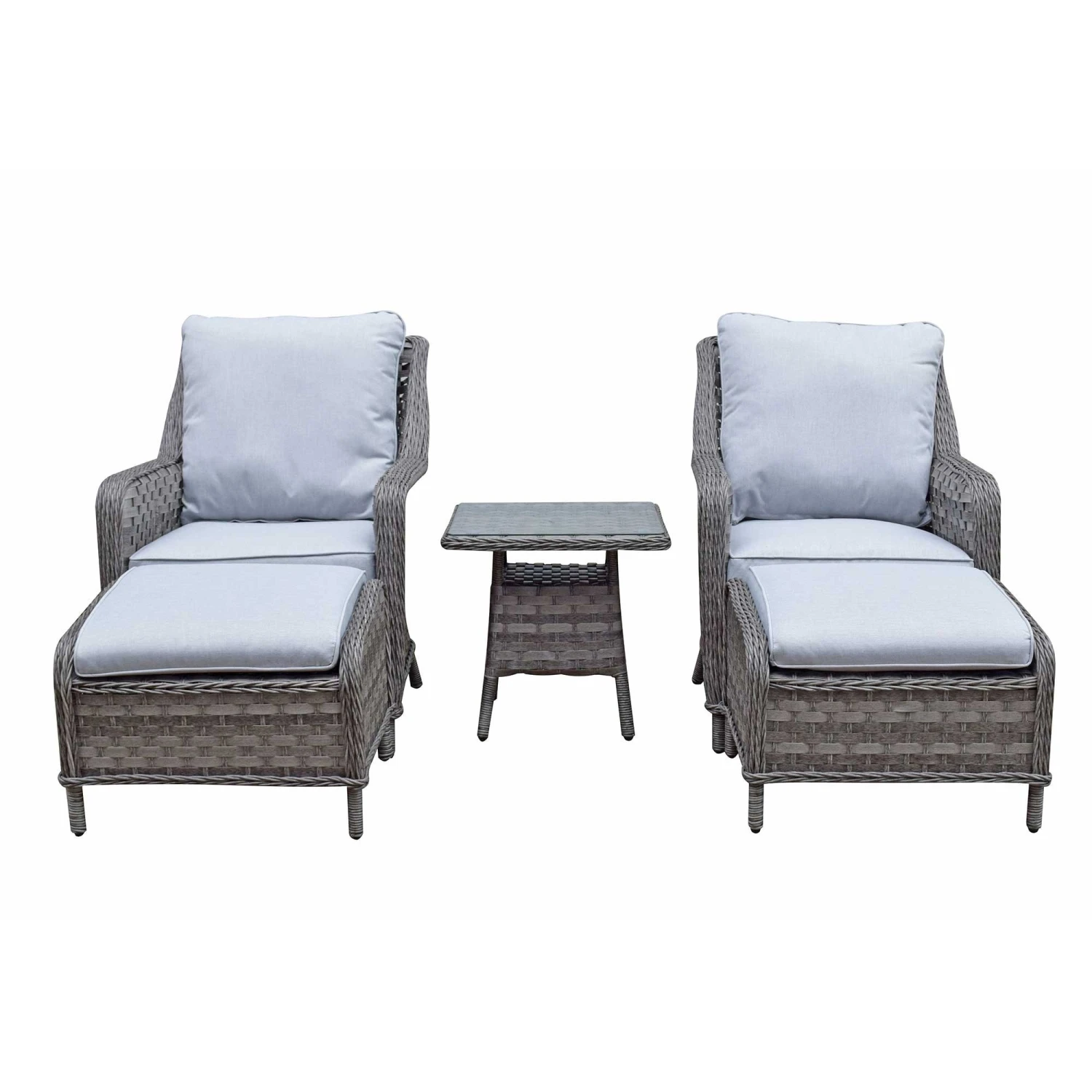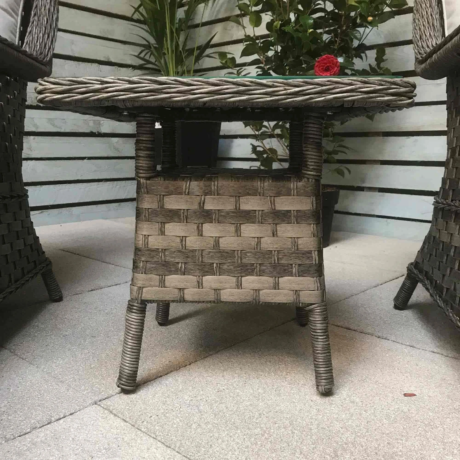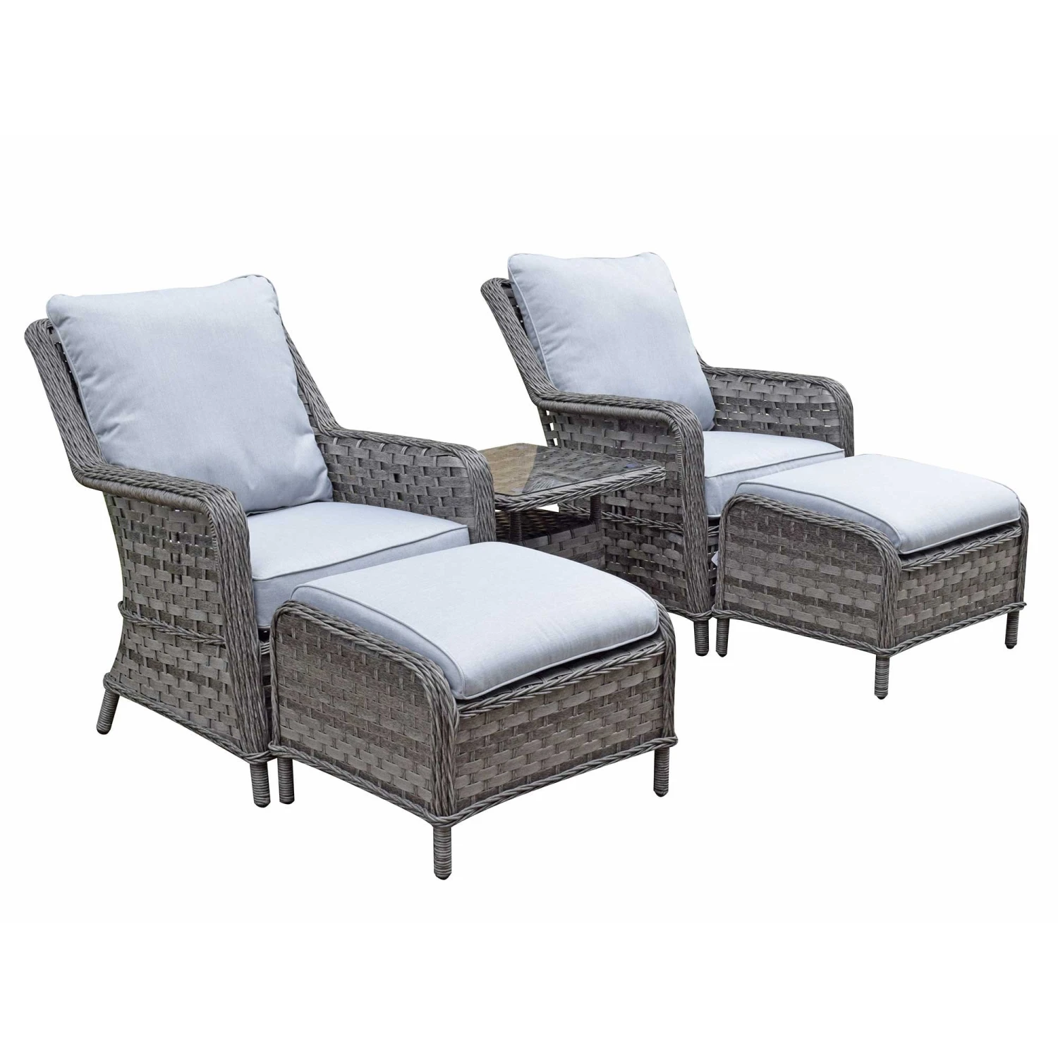 The Mia Multi Grey Rattan Lounge Set would be an excellent way to deck out the garden. A relaxing reclined back chair, scatter cushions for support and and to top it all off a footstool. The chairs are a set of 2 for someone to keep you company and also includes a fancy end table with a glass top. The table should be kept covered in extreme hit and scatter cushions should be put in a dry area when not in use.