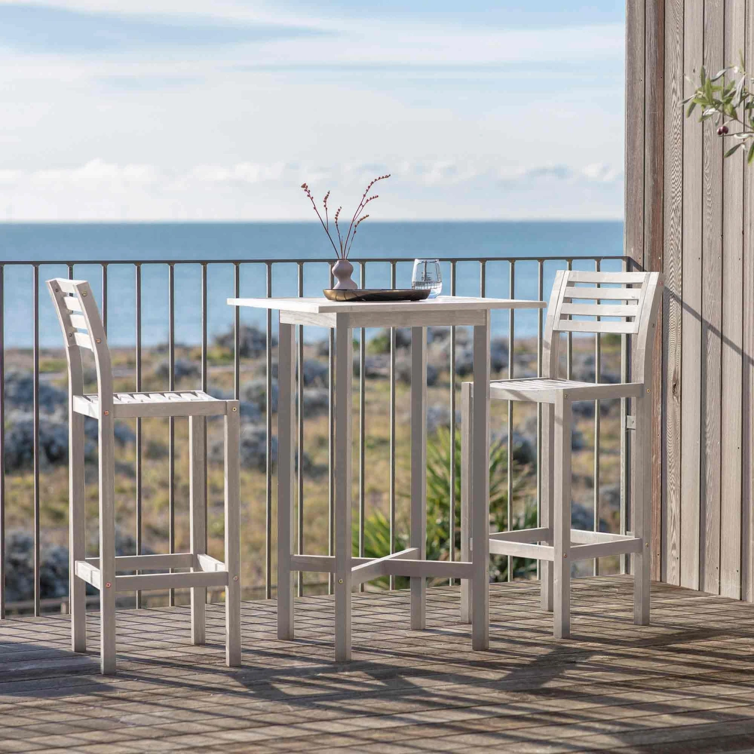 This Pelion Whitewash 2 Seater Outdoor High Bar Set is perfect for enjoying morning coffee, afternoon tea and beers in small gardens. Complete with a tall bar table and two bar stools with backs, this contemporary high bar set has a lovely whitewash painted finish for a traditional look. This high bar set is made from Acacia Wood.