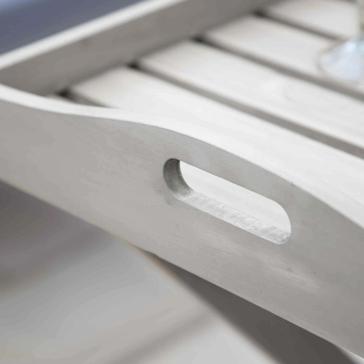 This Pelion Whitewash Outdoor Tray Table will make a great addition in any garden space! Featuring an extremely stylish tray-style top, this table is foldable for easy storage and can easily be opened for you and your guests! This tray table is crafted from high quality Acacia Wood with a whitewash painted finish.