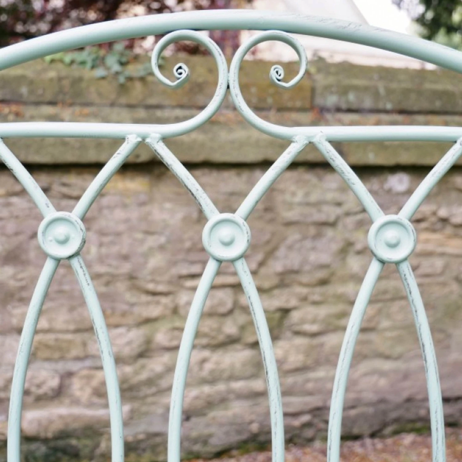 This stunning lovers bench is two chairs, attached by a two tier table in the middle, which has place to add a sun umbrella. The lovely pistachio green paintwork has some rustic touches worked through it, to create a relaxing garden vibe. Perfect for summer evenings with a loved one.