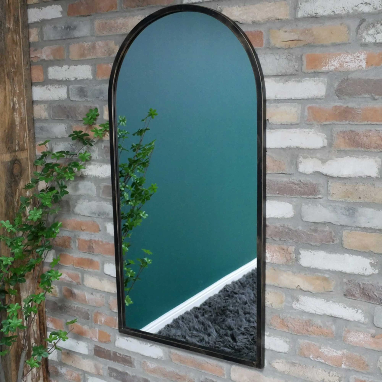 Showcase this Rustic Black Metal Round Arched Mirror on any wall and watch your space be transformed! Made with metal and encased by a black frame, this round arch mirror provides a rustic feel to your surroundings. Ideal for wall mounting.Â