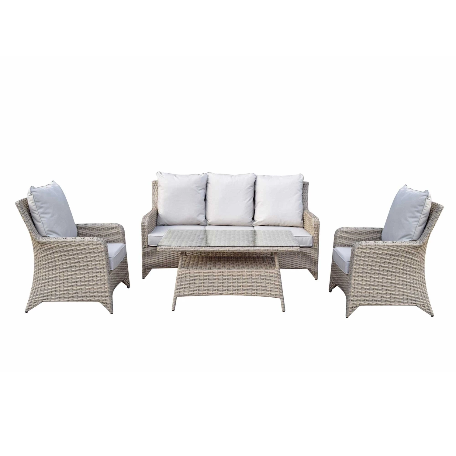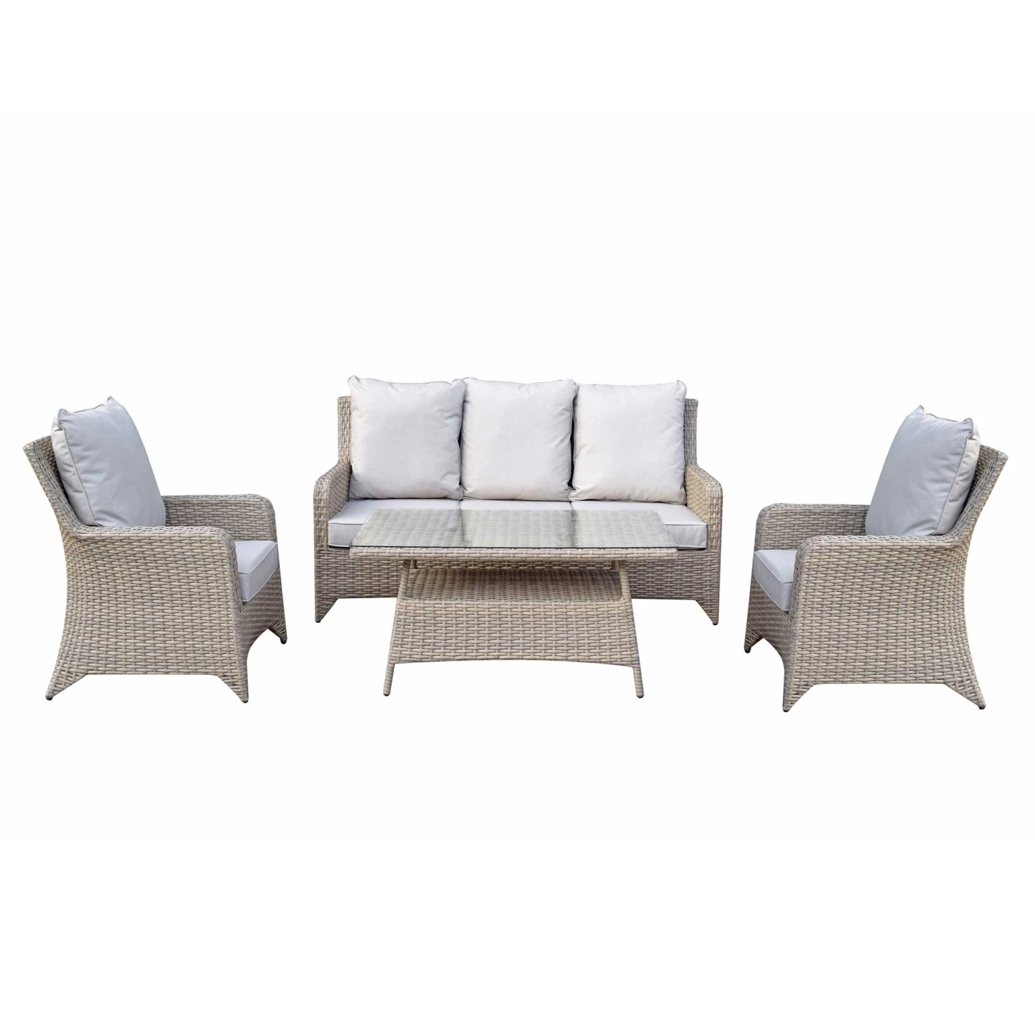 The Sarah Grey Rattan 5 Seater Sofa Set is sure to impress including one sofa, two chairs and a high coffee table. This means there is more than enough seating for when friends and family come over for garden parties and special occasions. The scatter cushions should be kept in a dry area when not in use and the glass top coffee table should be covered in extreme heat.