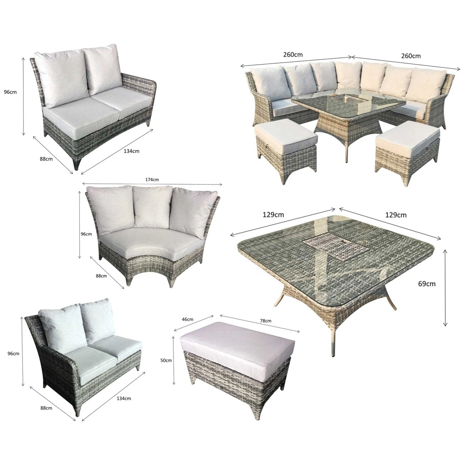 The Sarah Natural Rattan Corner Sofa Dining Set is sure to spruce up the garden and give it lots more seating for when family and friends visit including a corner sofa and 2 benches. This set also includes a table to place food on and even an impressive ice bucket inset into the actual table for the drinks. Scatter cushions should be kept in a dry area when not in use and the glass table should be covered in extreme heat.