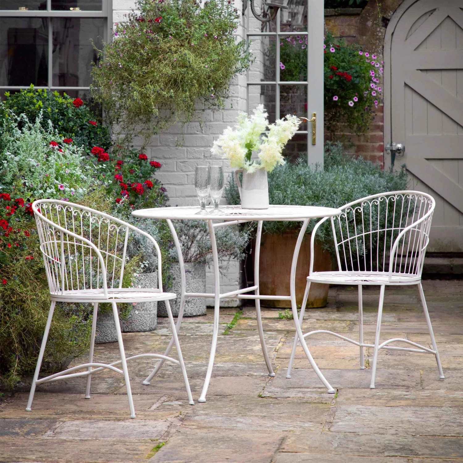 Enjoy being outdoors this summer when you purchase the Siracusa 2 Seater Vanilla Bistro Set to eat or relax in the garden. Crafted from iron metal in a white finish, it comes with a round table with 2 chairs featuring a curved back and lovely patina finish. Perfect for patio areas, cosy corners or a balcony.