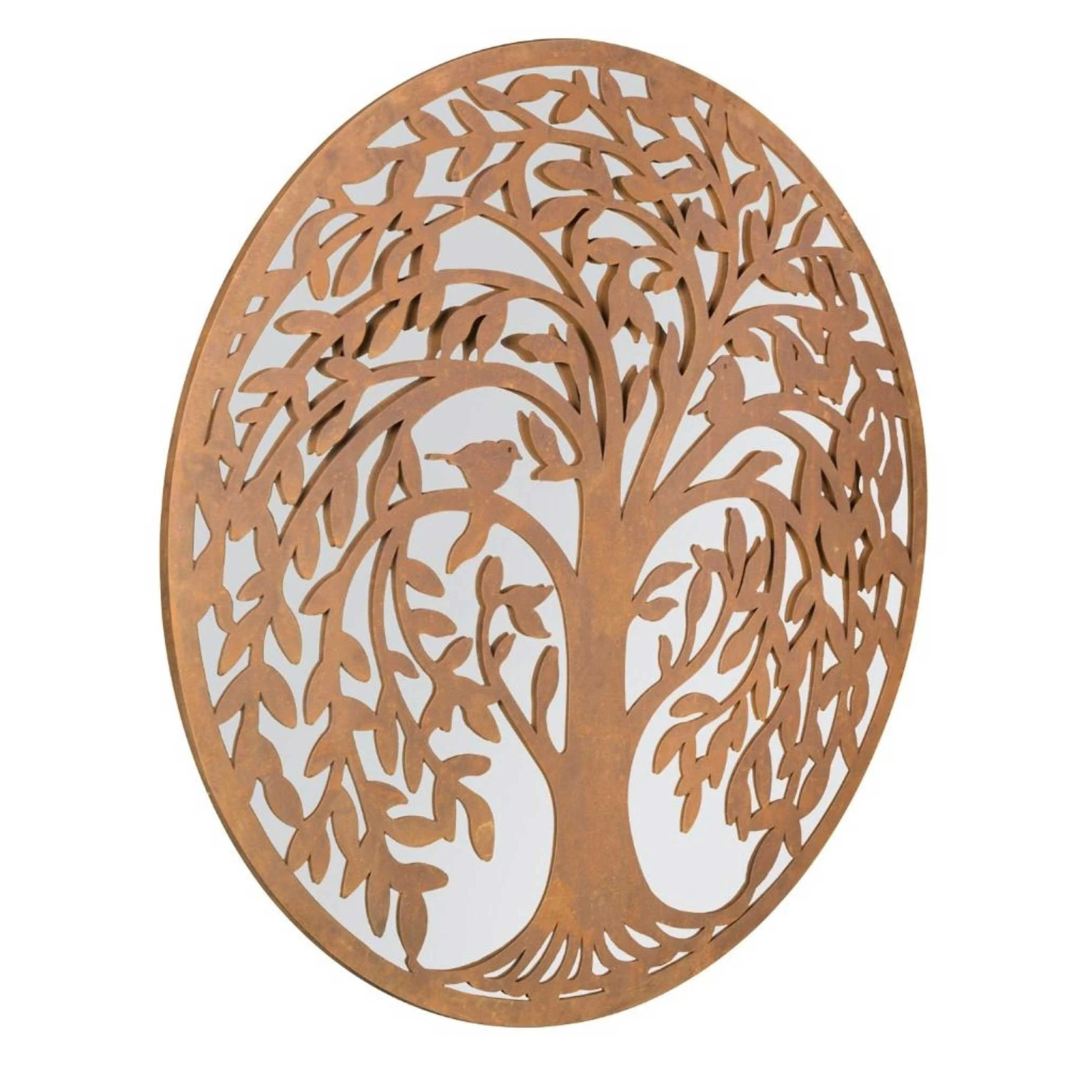 Simply attach a screw and hang this Swirl Tree Design Round Garden Mirror to any outdoor wall or fence! Instantly enhancing your outdoor space, this round garden mirror will be the main focal point and impress your guests and passers-by! The round outdoor mirror features a swirl deer tree design.Â