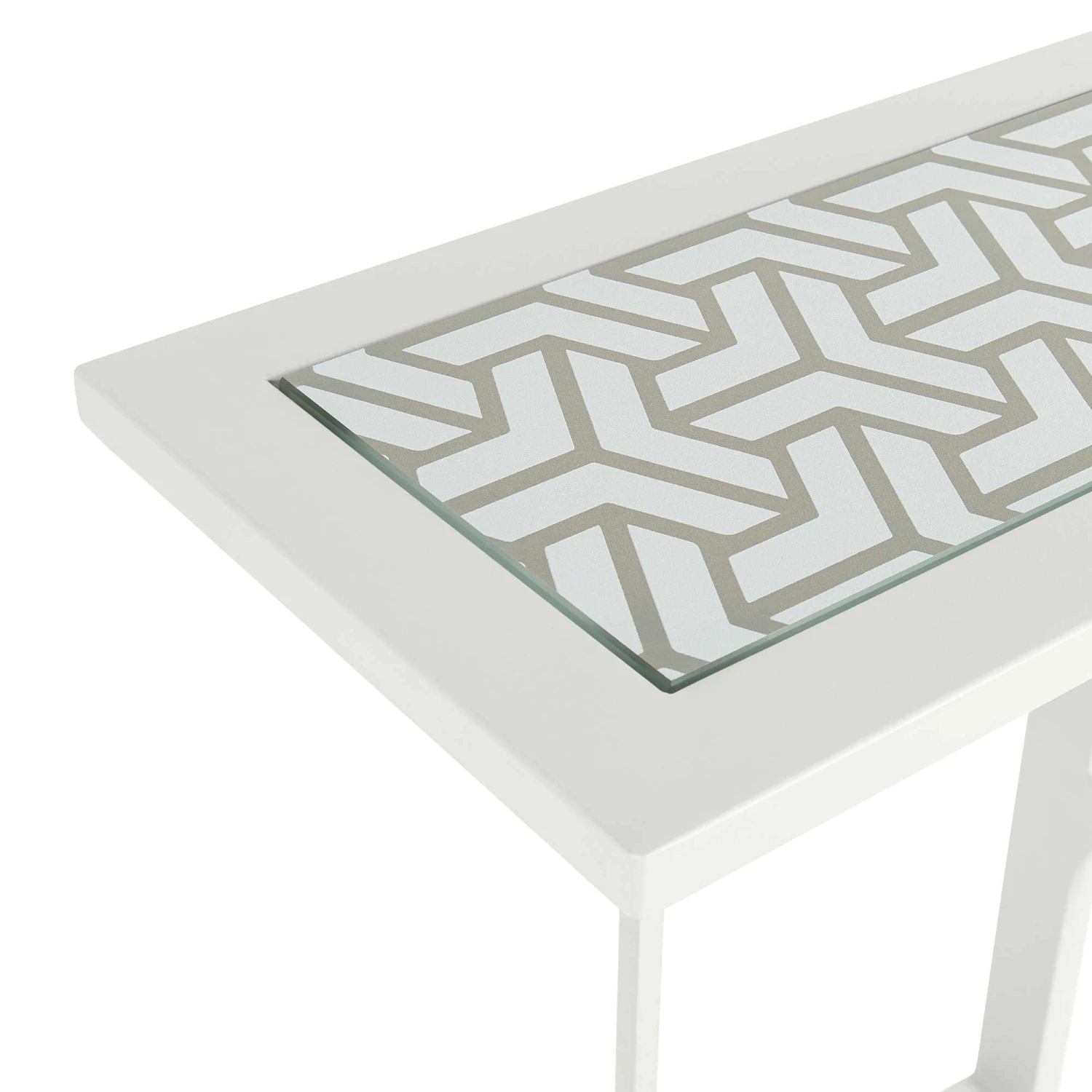 Stay refreshed in the garden with this White Patterned Top Outdoor Sofa Table! This outdoor sofa table is ideal for placing beers and cocktails while you soak up the rays! The sofa table neatly slides under any garden sofa or section unit, and it’s aluminium rust proof frame is made to withstand all weather conditions. Finished with a unique patterned top. Also available in Grey.